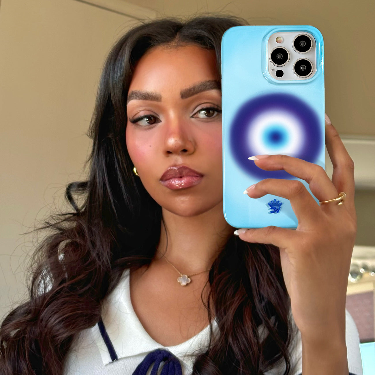 Protect your energy! This MagSafe case features a soft-focus evil eye in an array of blue shades with a contrasting royal blue bumper.