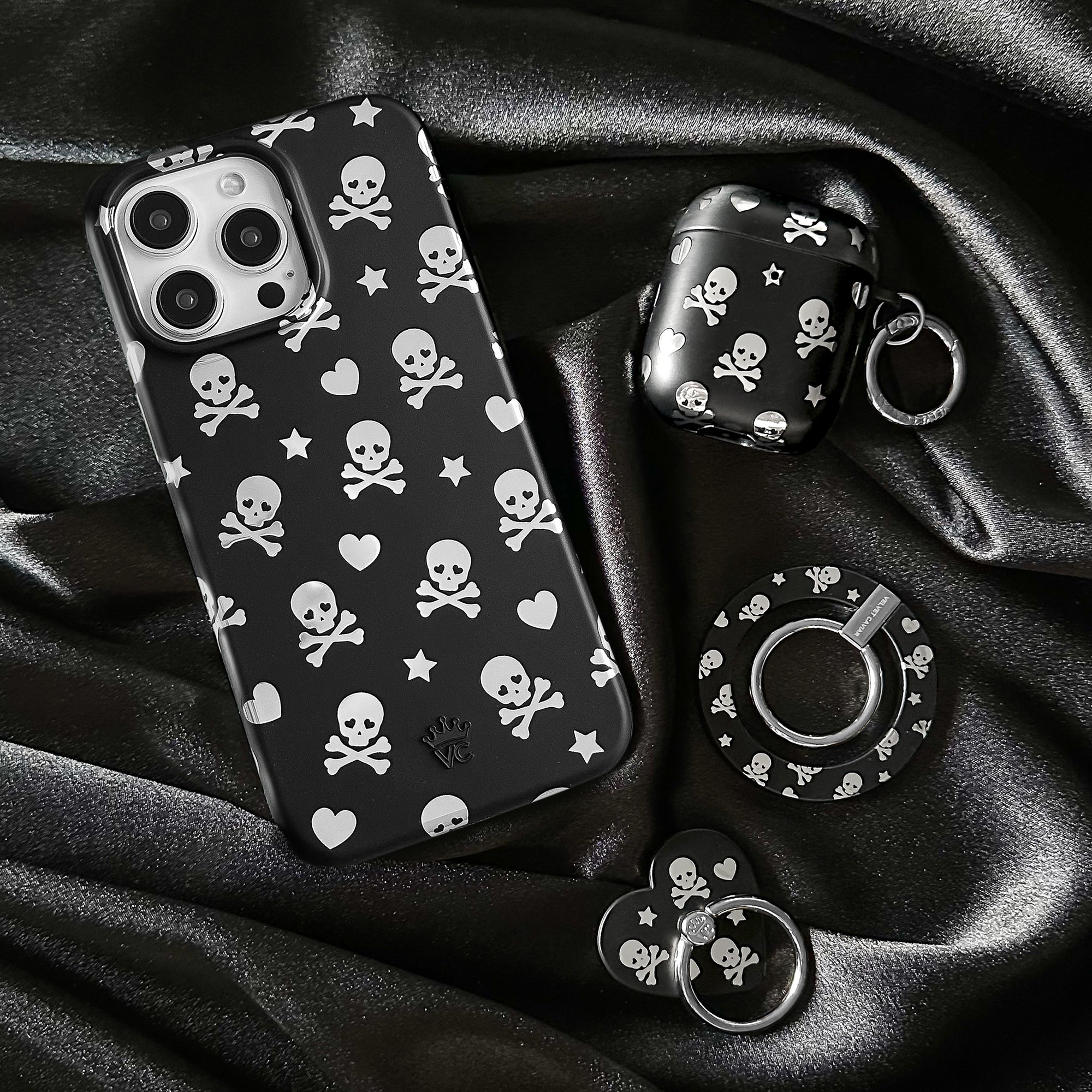 Happy Halloween! This Limited Edition MagSafe case features chrome skulls, hearts and stars all on a matte black base.