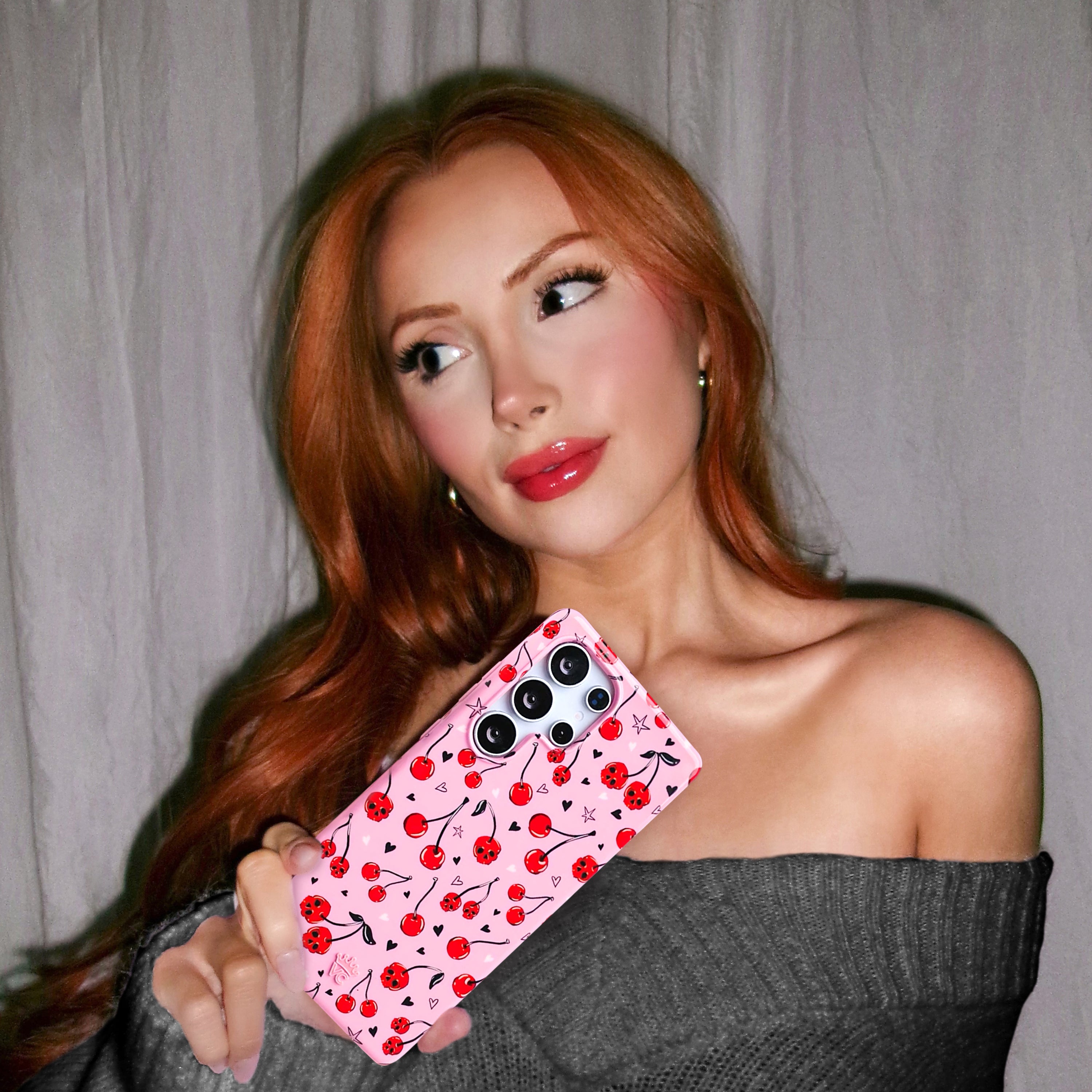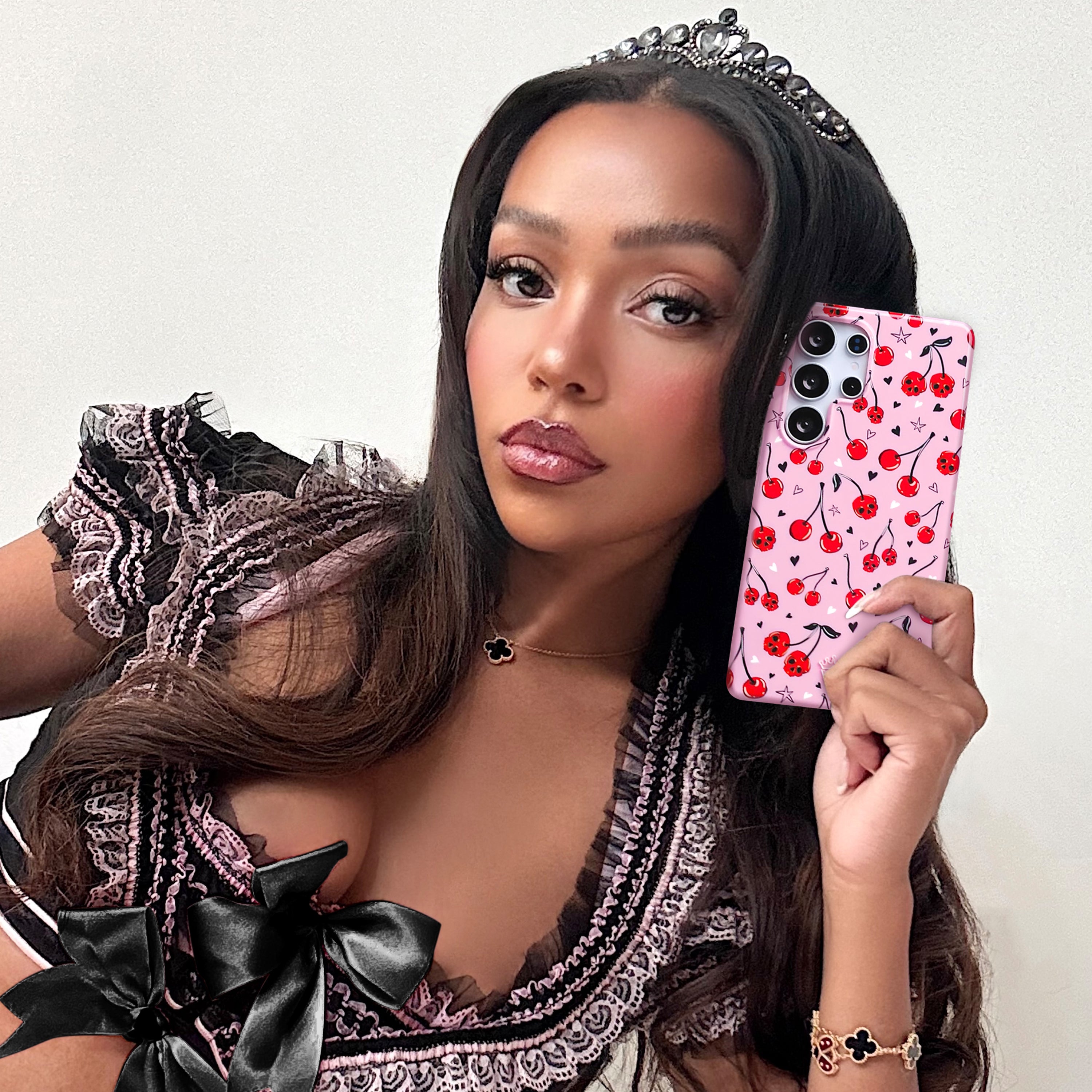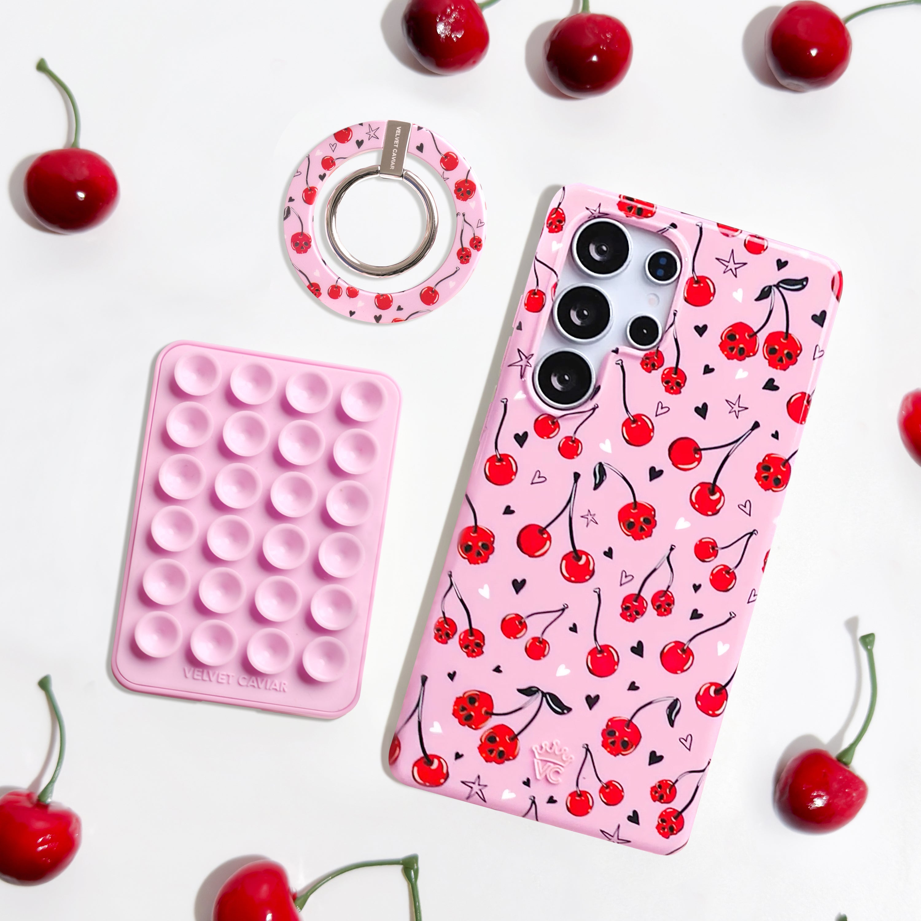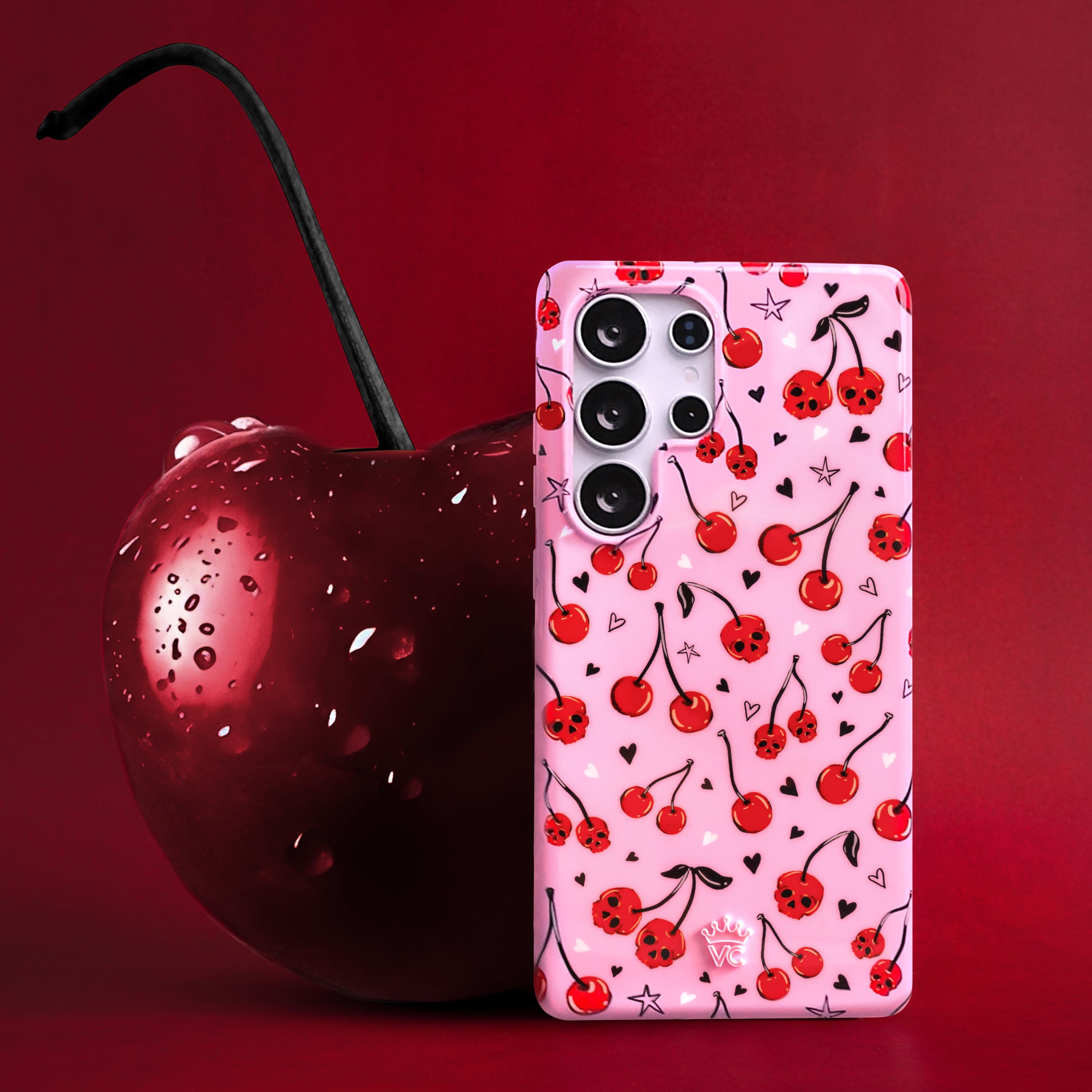 Happy Halloween! This protective case features red cherry skulls with hand drawn stars and hearts on a glossy light pink base.