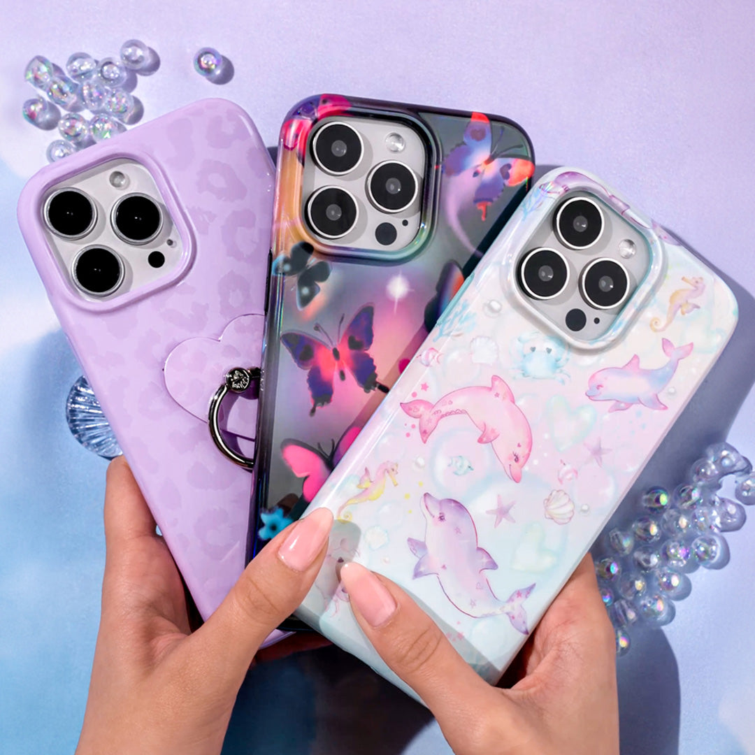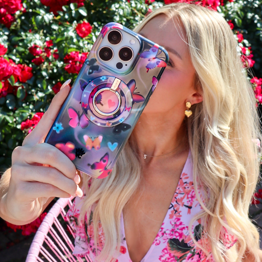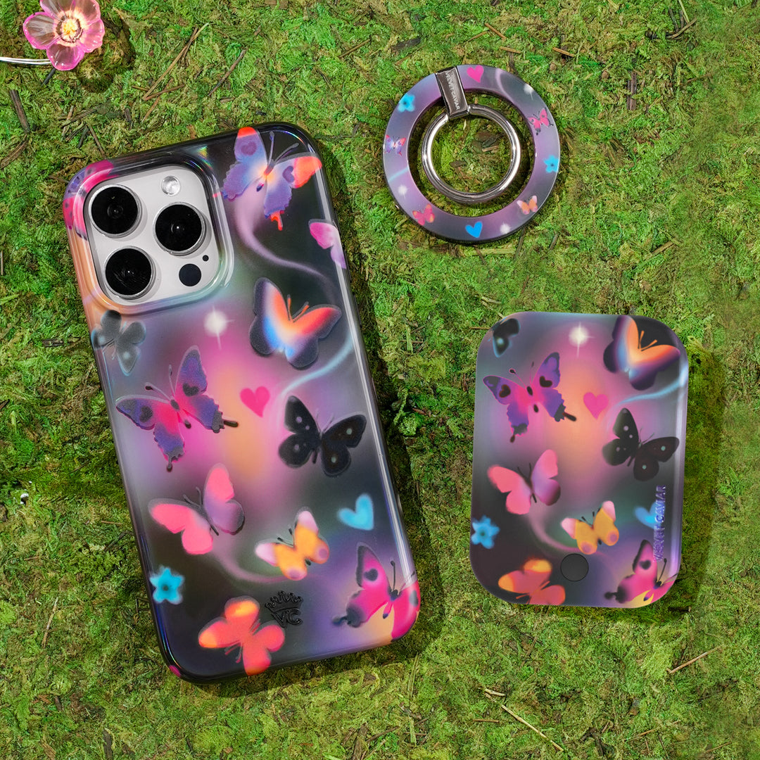 Embrace your ethereal aura! This Limited Edition case features beautiful butterflies in stunning sunset tones on a dark holographic base.