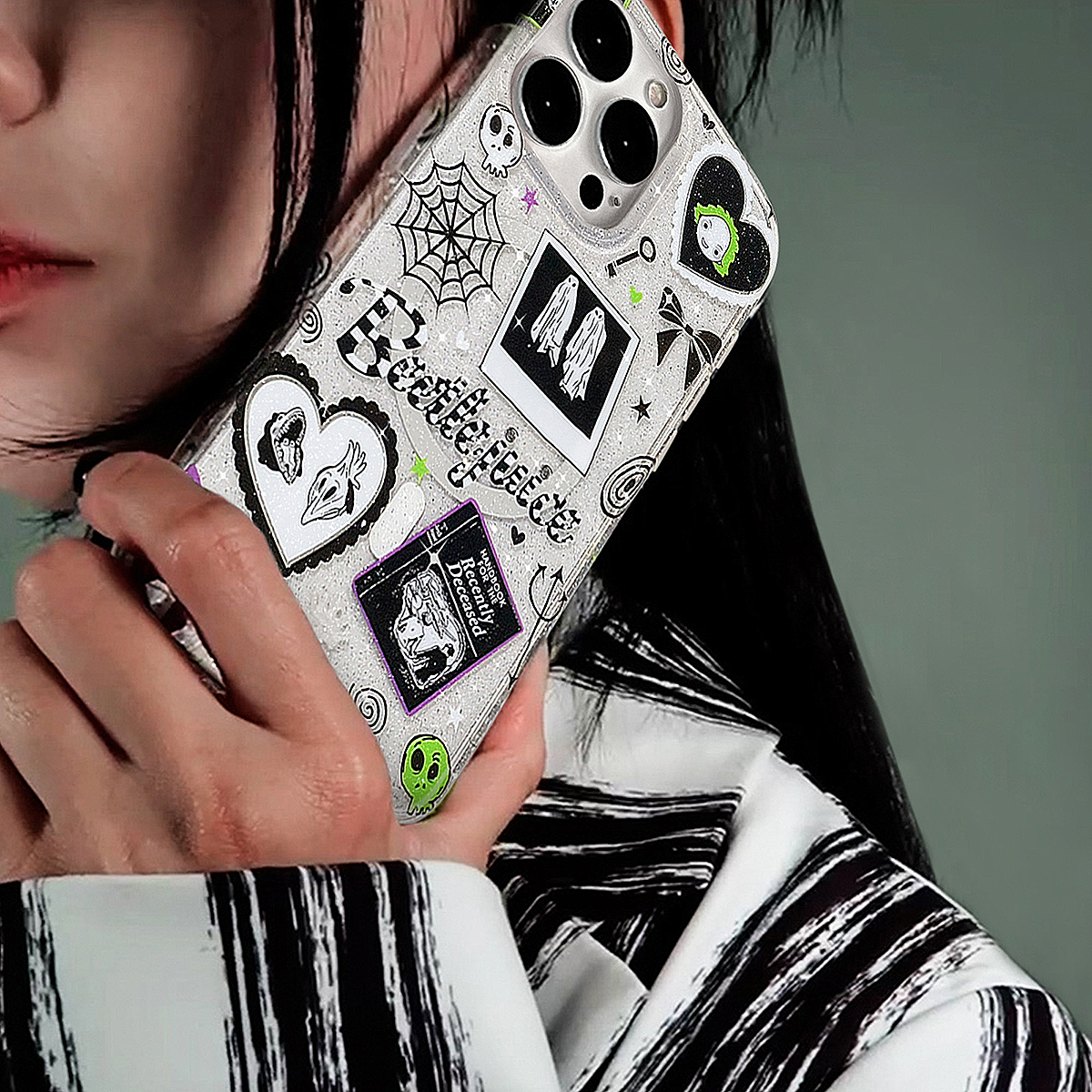 This MagSafe case features an array of haunting nods to Beetlejuice all on a clear case with silver glitter sprinkled into the base and bumper.