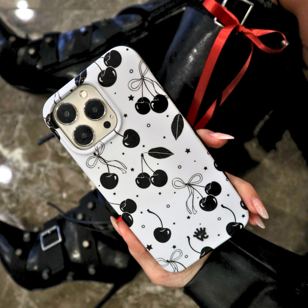 It-Girl Energy! This MagSafe case features an array of black cherries on a glossy white base with ribbons and black stars throughout.