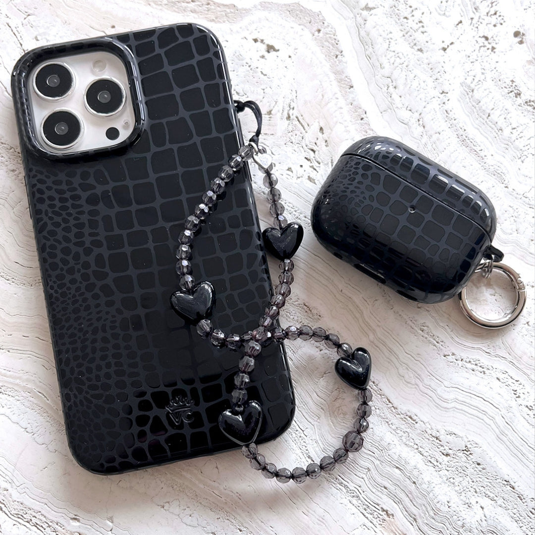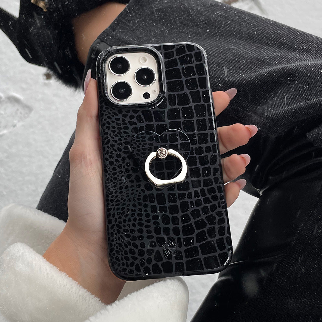 Classic and Luxe. This ultra-protective case features a glossy embossed crocodile pattern on a monochromatic matte black base.