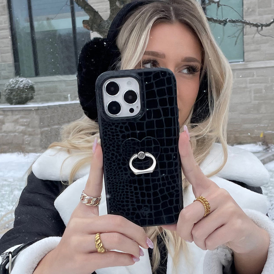 Classic and Luxe. This ultra-protective case features a glossy embossed crocodile pattern on a monochromatic matte black base.