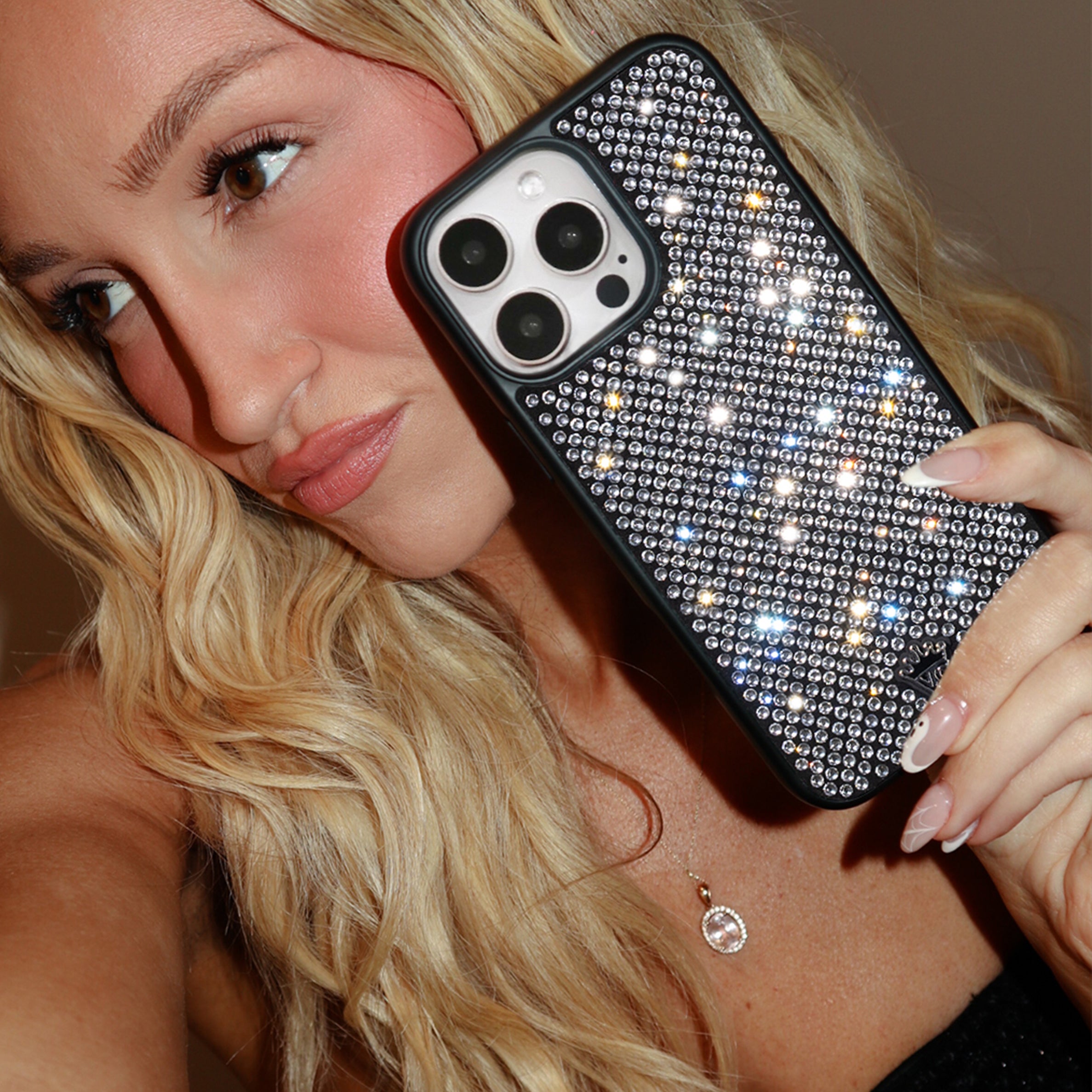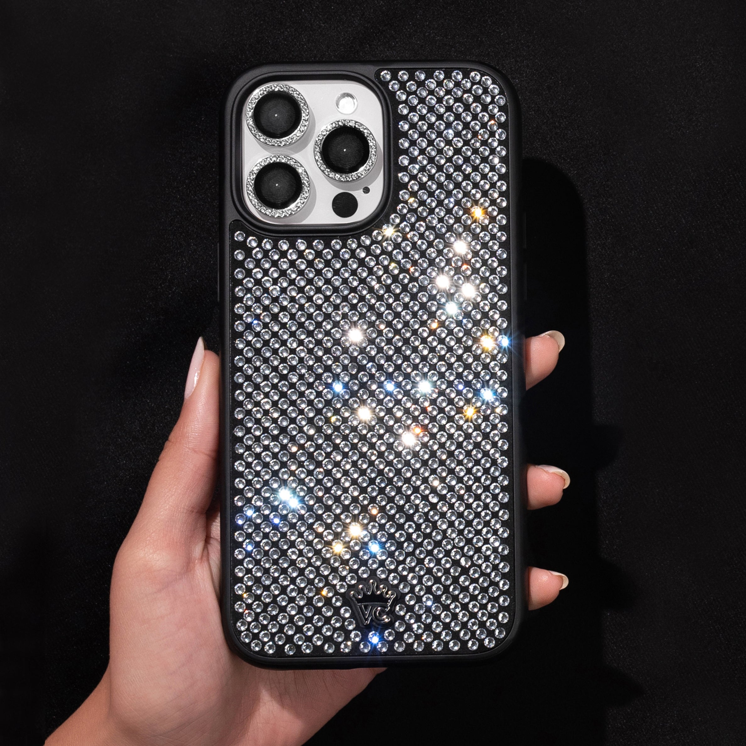 The most dazzling crystal case ever made! Covered in 600+ hand-placed glass crystals that sparkle like no other. Protected in an 8' drop tested matte black case. This case is not compatible with MagSafe or wireless charging.