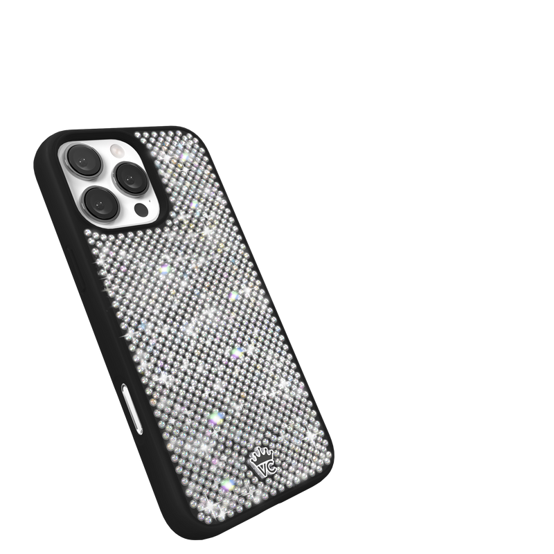 The most dazzling crystal case ever made! Covered in 600+ hand-placed glass crystals that sparkle like no other. Protected in an 8' drop tested matte black case. This case is not compatible with MagSafe or wireless charging.