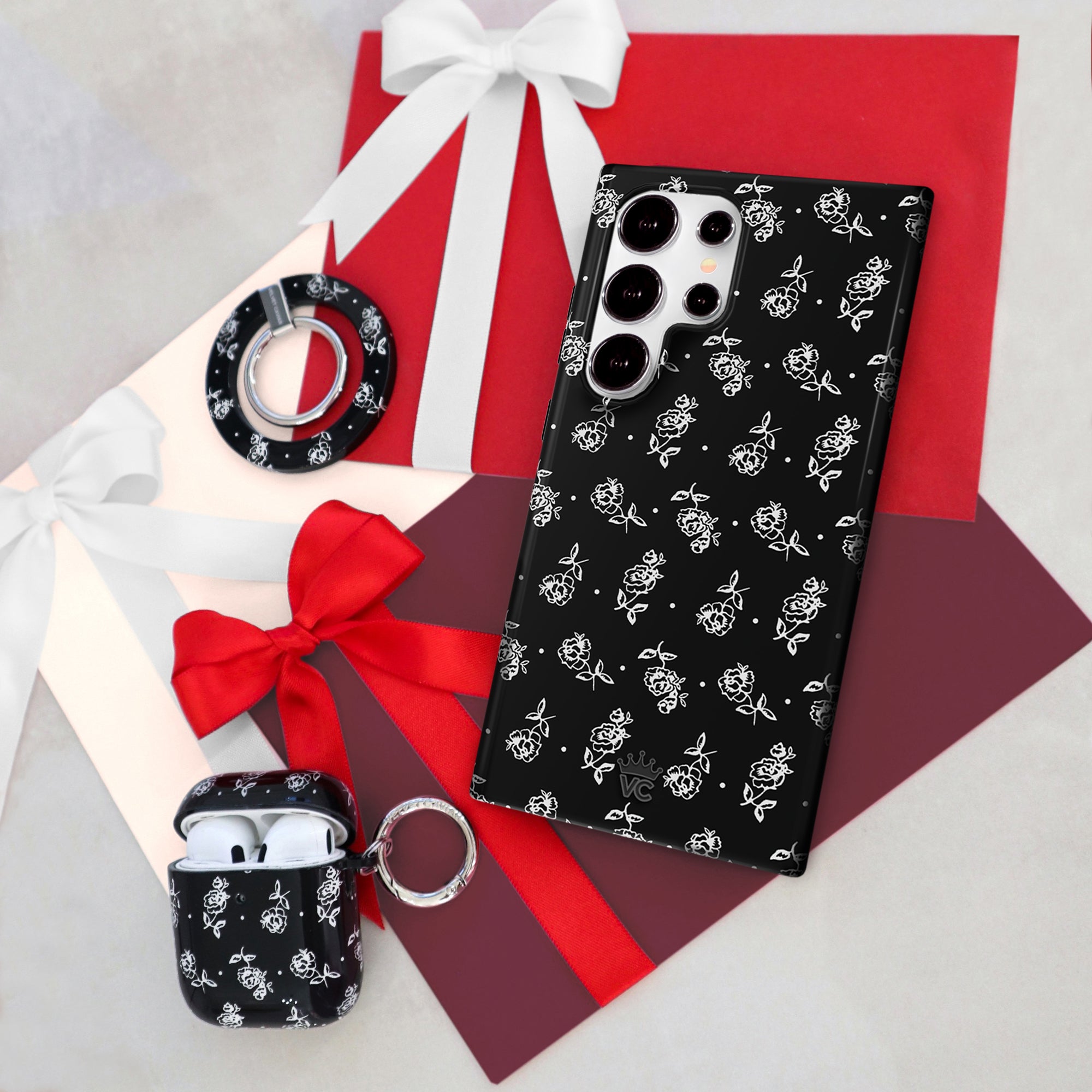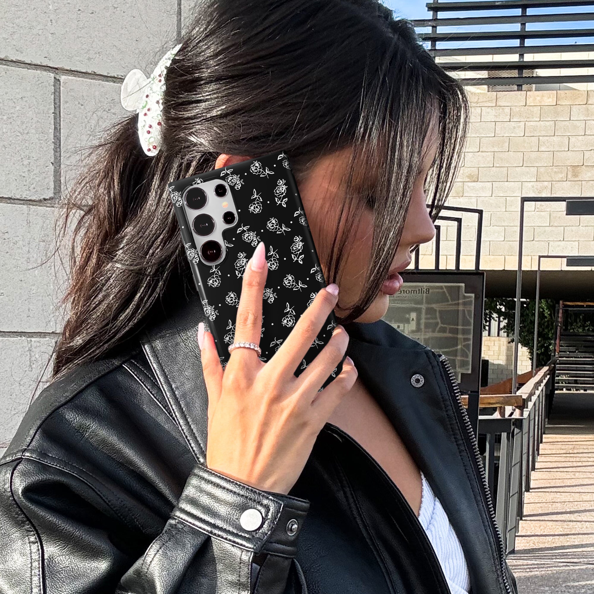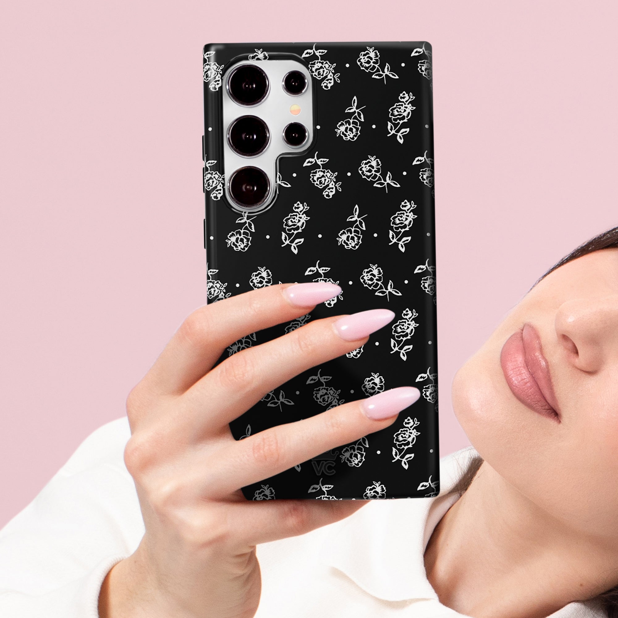 Classic and chic! This protective glossy case features a 90's inspired white floral pattern and small polka dots on a black base with a monochromatic black bumper.