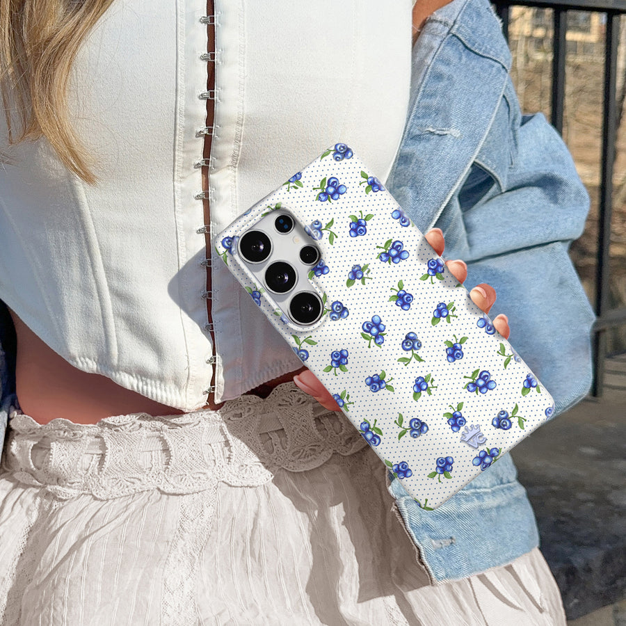 So berry cute! This Limited Edition protective case features an array of watercolor blueberries on a glossy white base with small polka dots throughout and a light blue bumper.