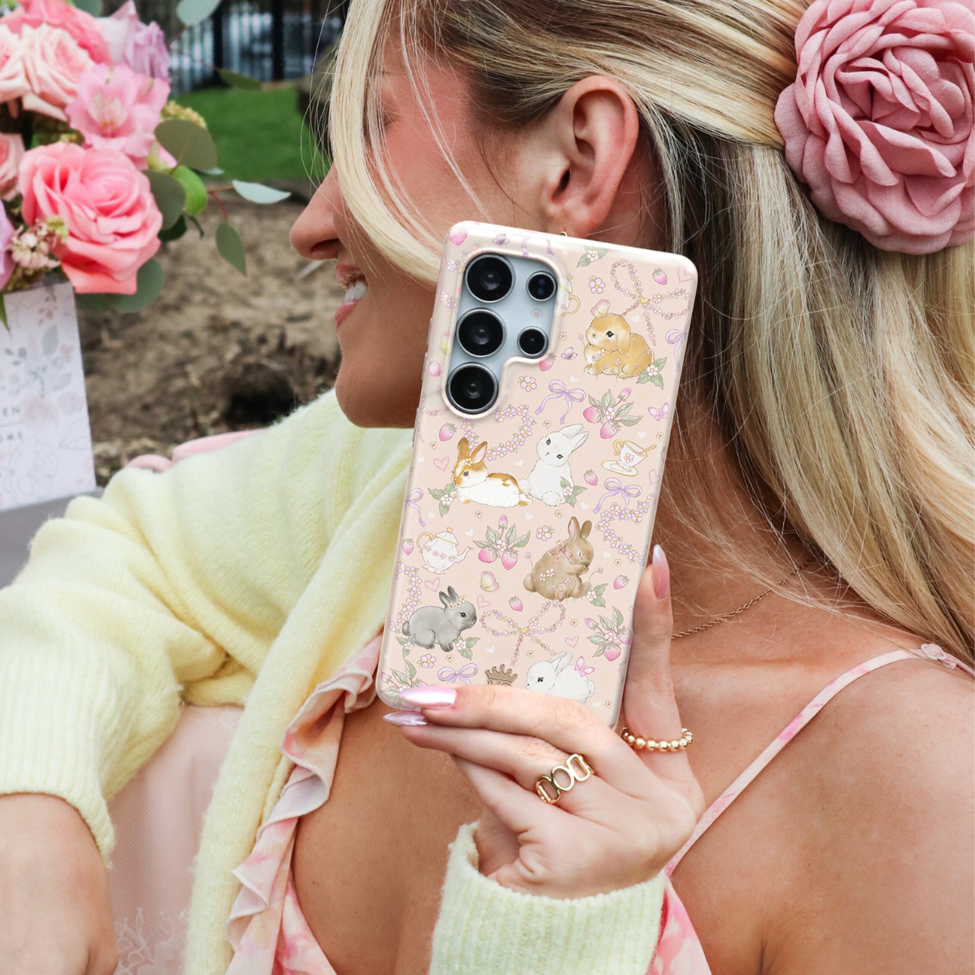 Some bunny loves you! This protective case features adorable hand drawn bunnies, bows, strawberries, and tea cups all on a neutral beige base and bumper.