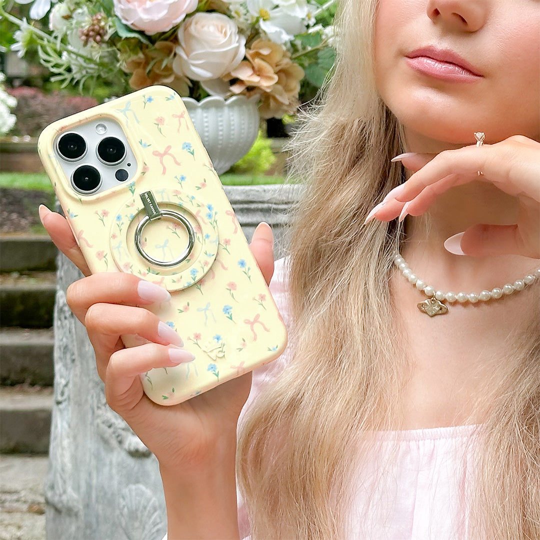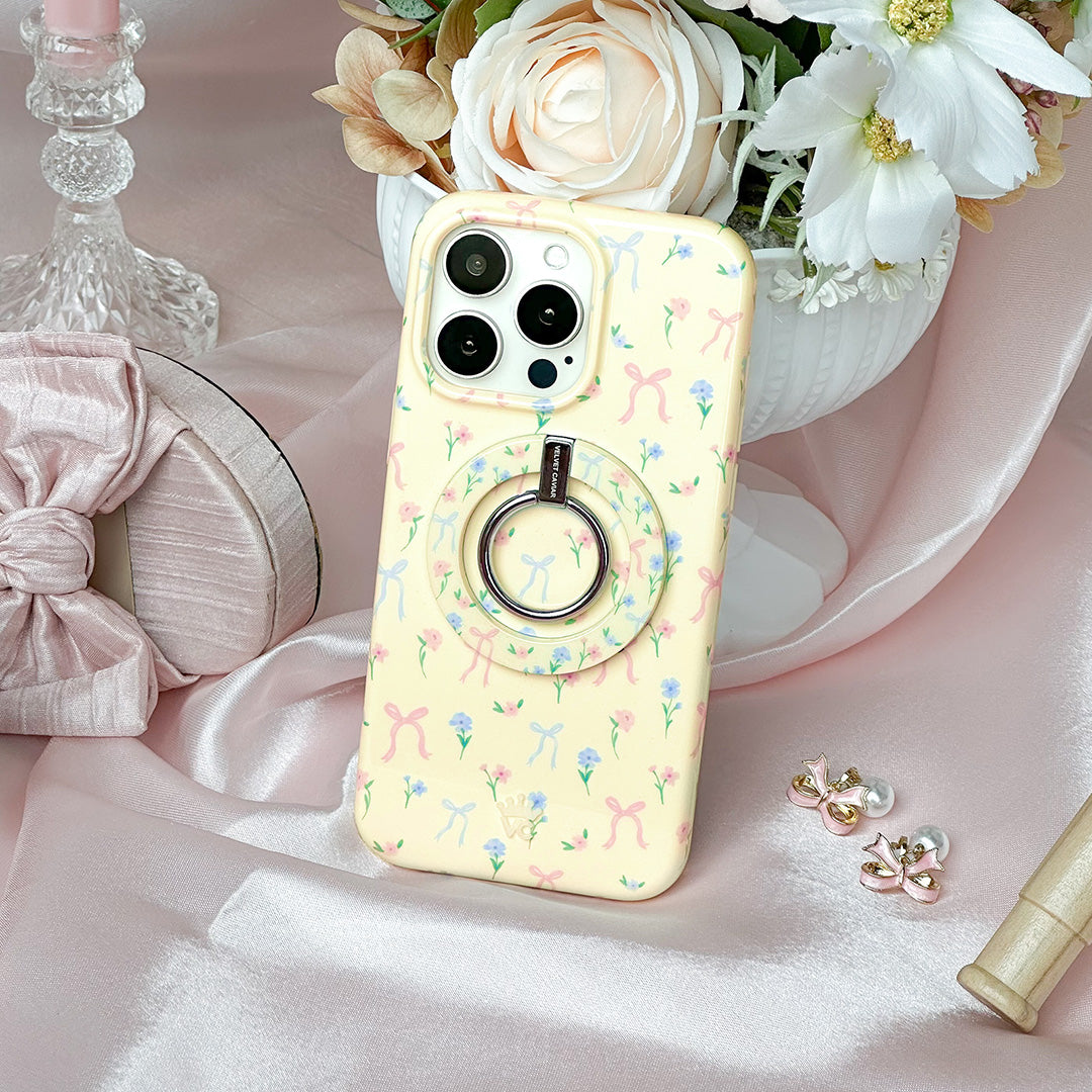 Coquette Core! This Limited Edition MagSafe case features danish pastel bows and flowers on a glossy buttercream base.