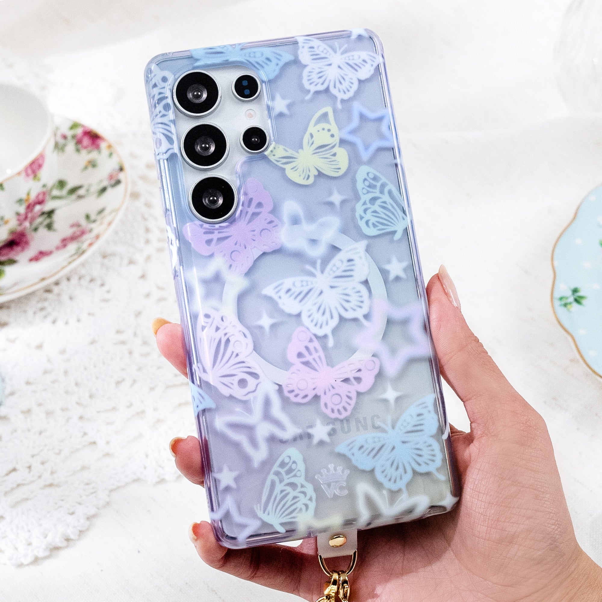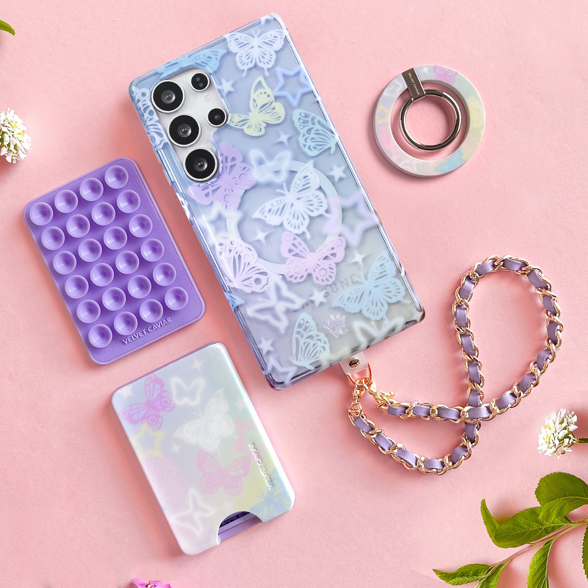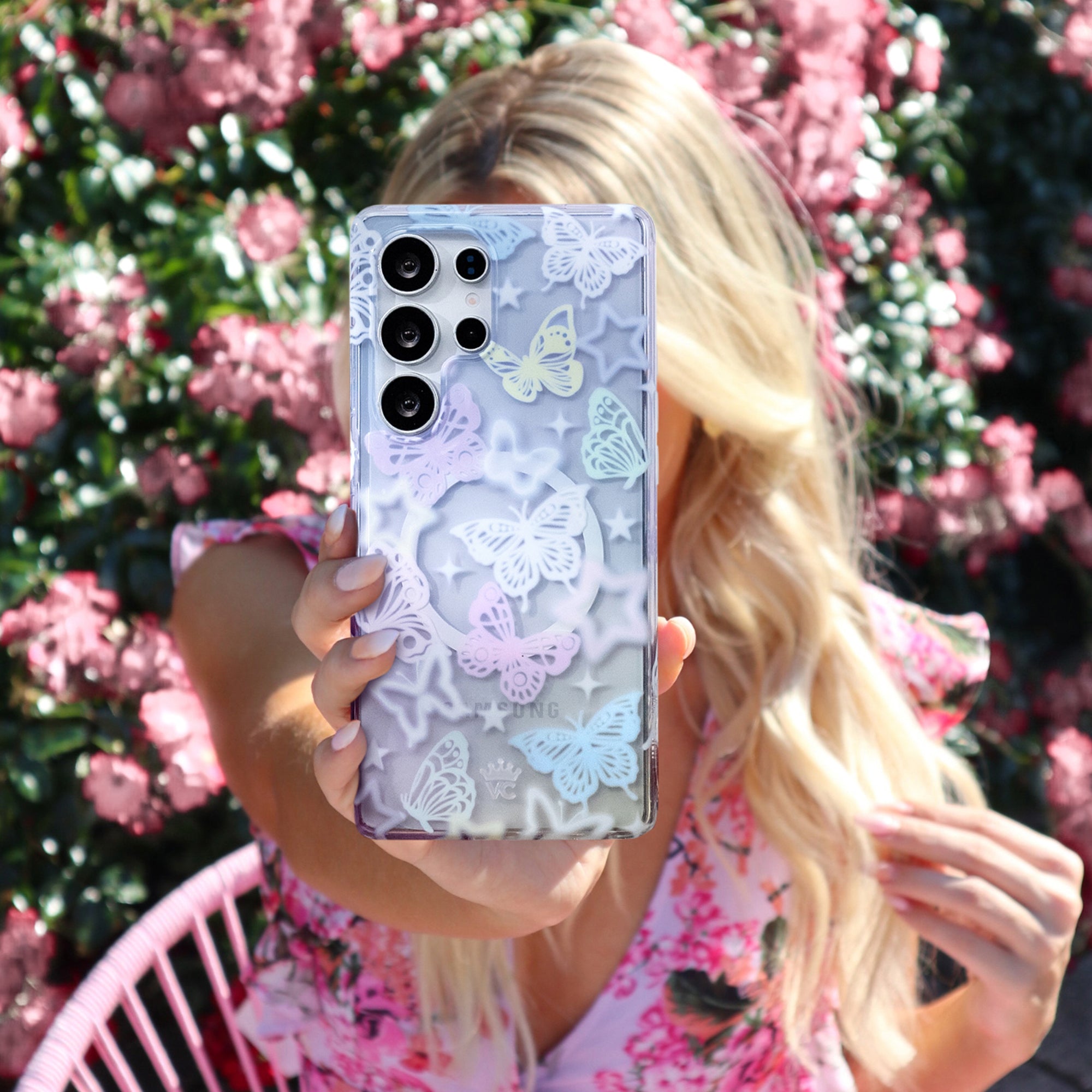 Give them butterflies! This dreamy protective case features magical pink, lilac, butter yellow and baby blue butterflies on an pastel ombre clear base.