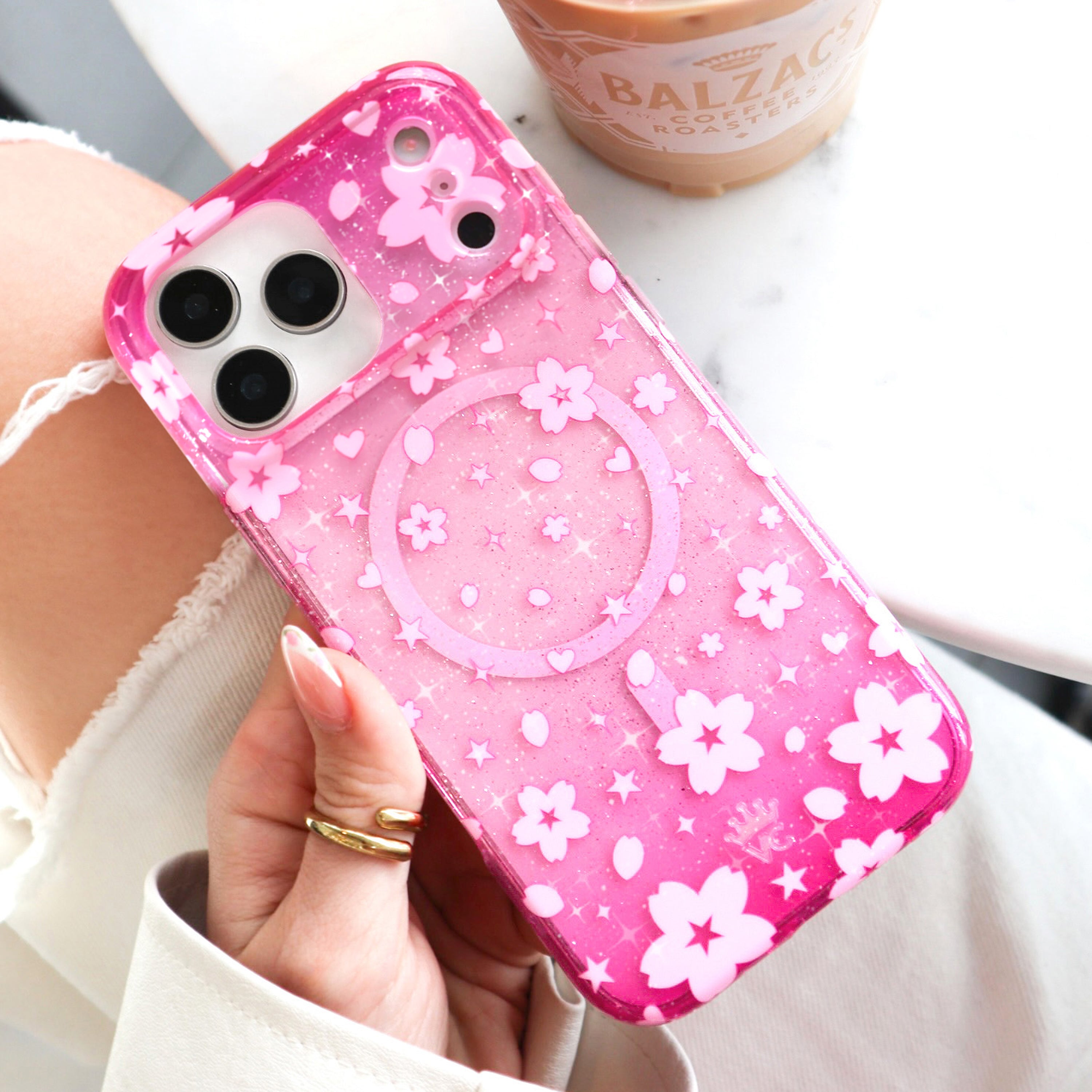 In full bloom! This Special Edition MagSafe case celebrates Cherry Blossom Season with stunning pink sakura flowers scattered on a ombre clear pink base with silver stardust glitter sprinkled throughout the base and bumper.
