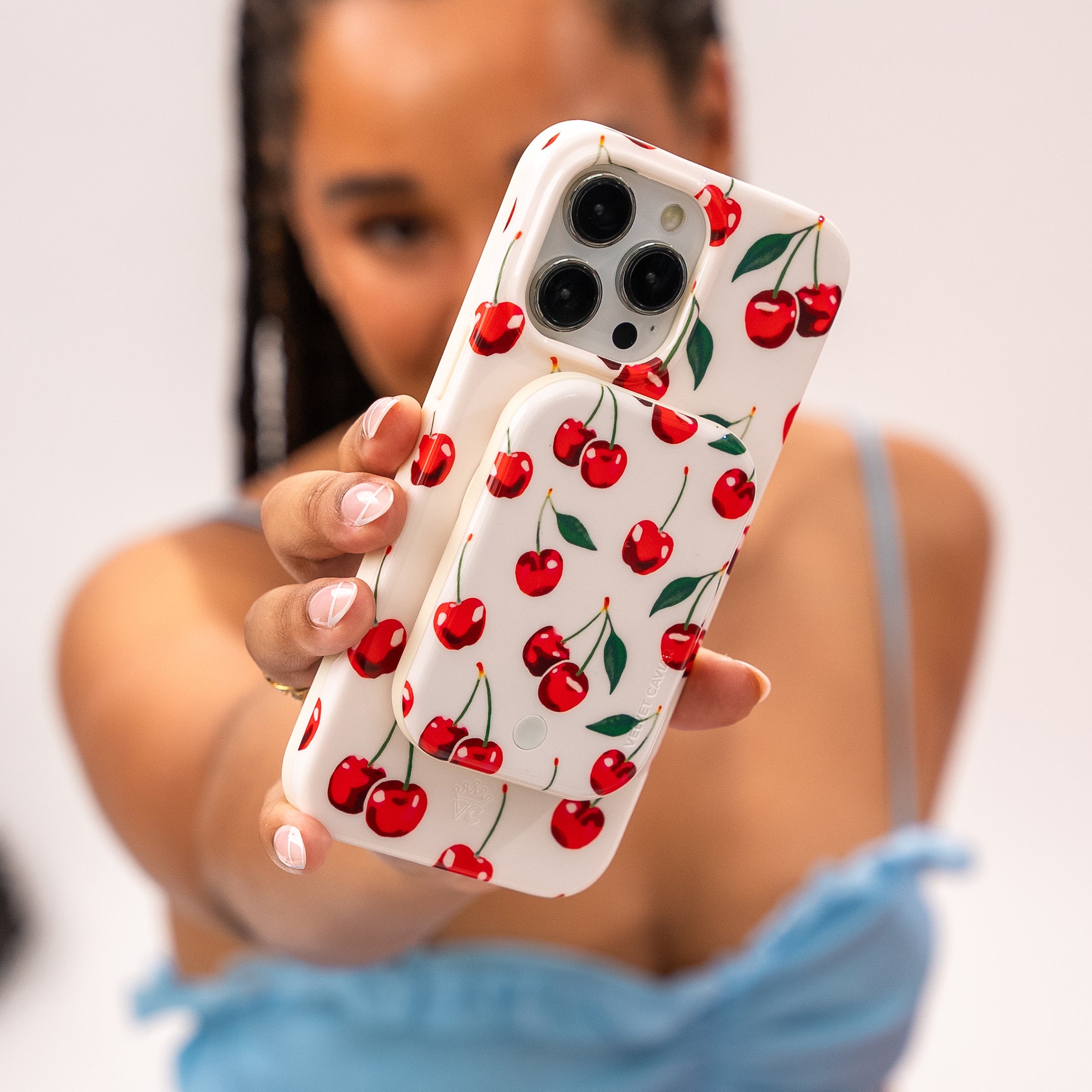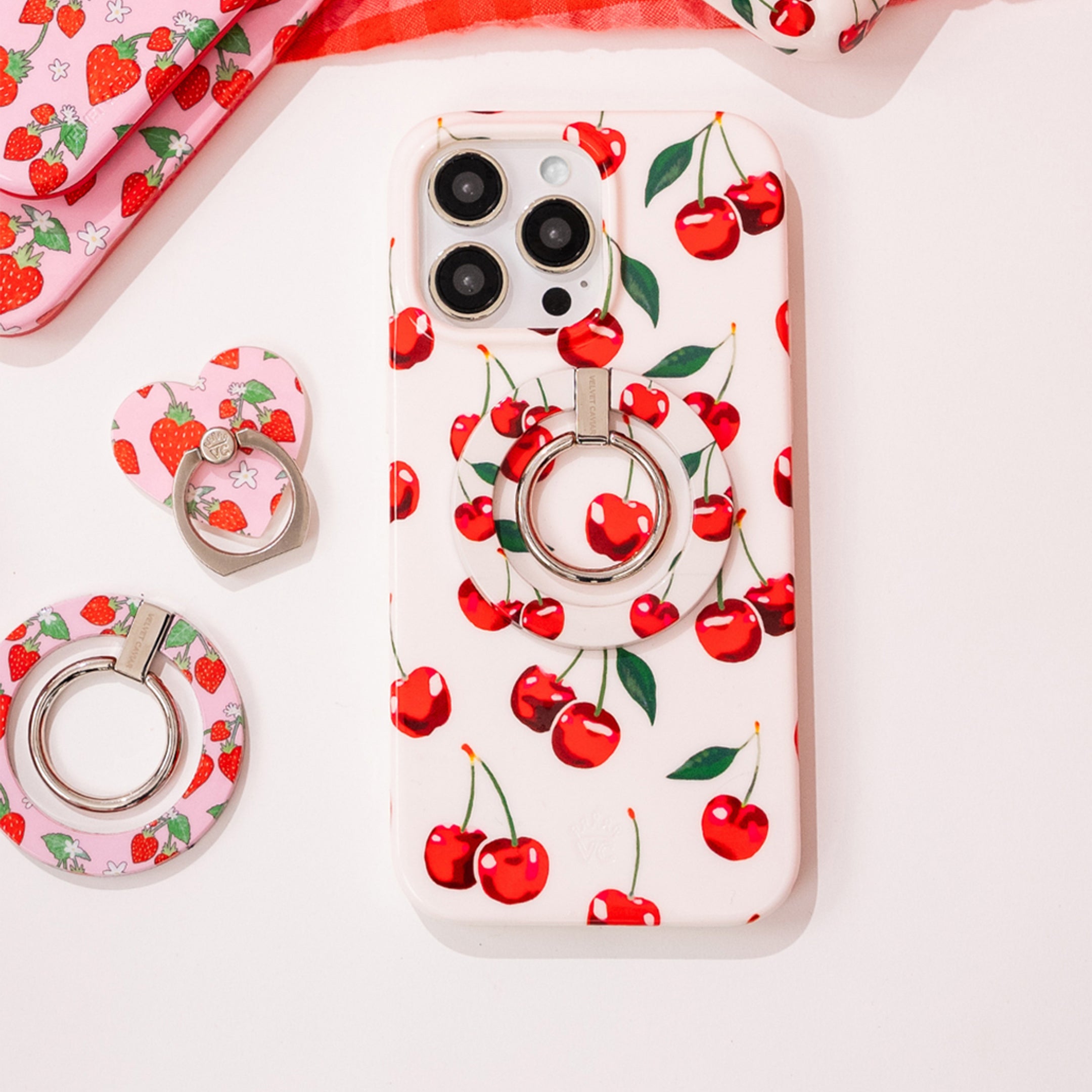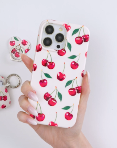 Oui Mon Cheri! This protective case features an array of bright red cherries on a glossy off white base.