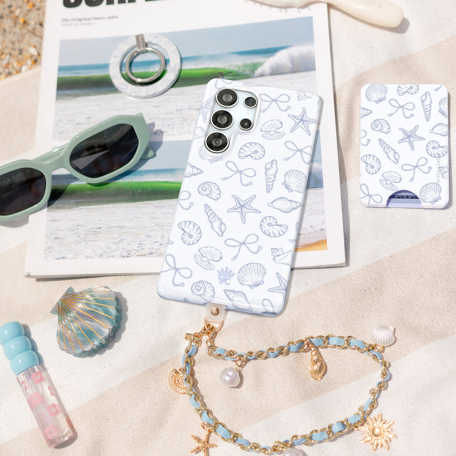 Ocean Air and Coastal Vibes! This protective phone case features nautical blue shells, bows, and starfish all on a glossy off white base.