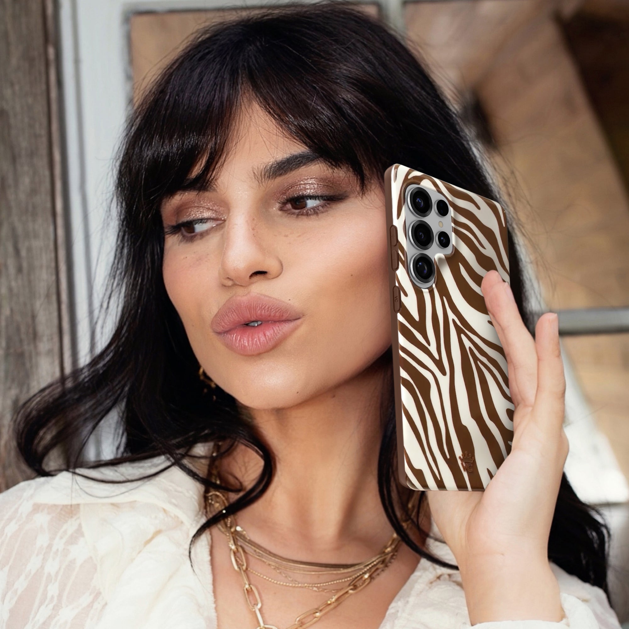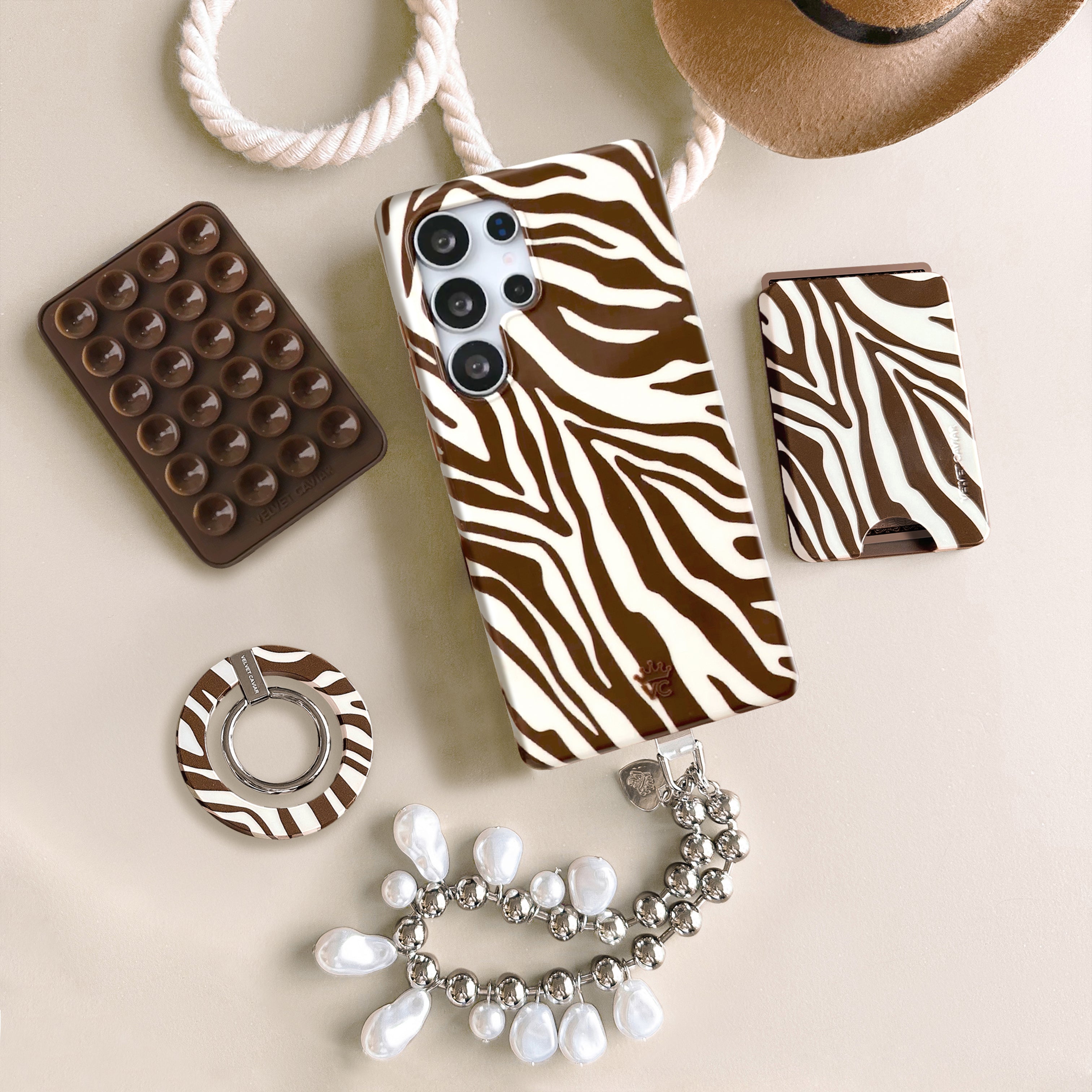 Never change your stripes! This ultra chic phone case features a rich brown and off white glossy zebra pattern with a matching rich brown bumper