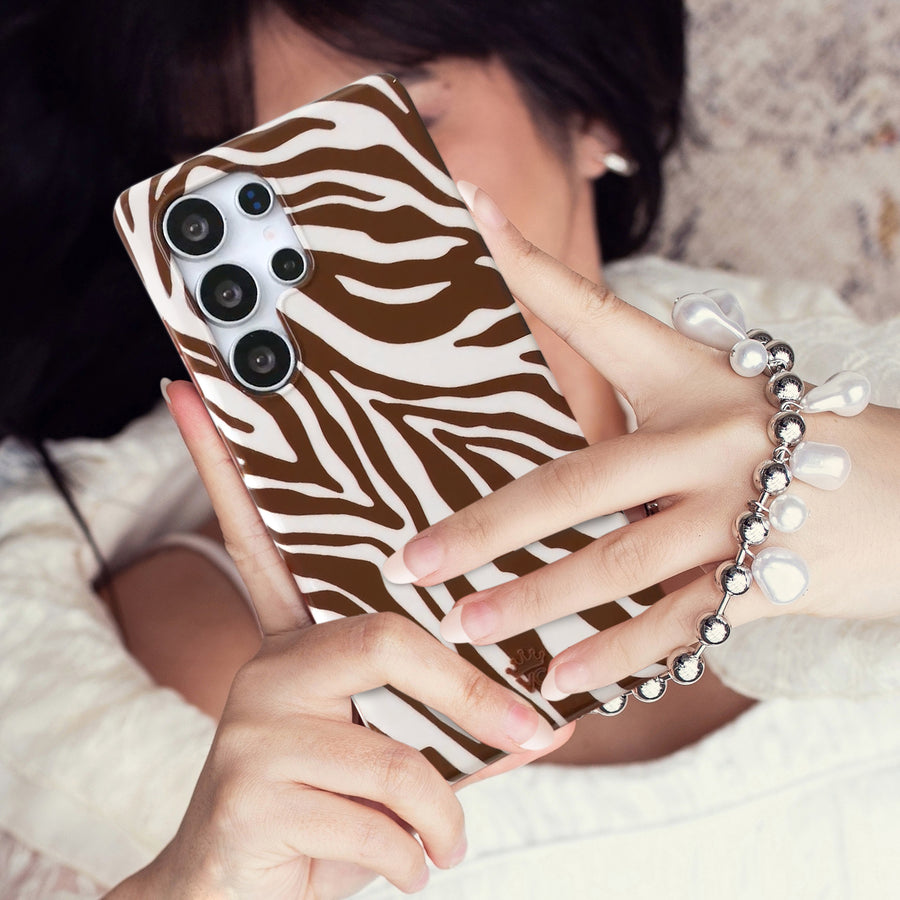 Never change your stripes! This ultra chic phone case features a rich brown and off white glossy zebra pattern with a matching rich brown bumper