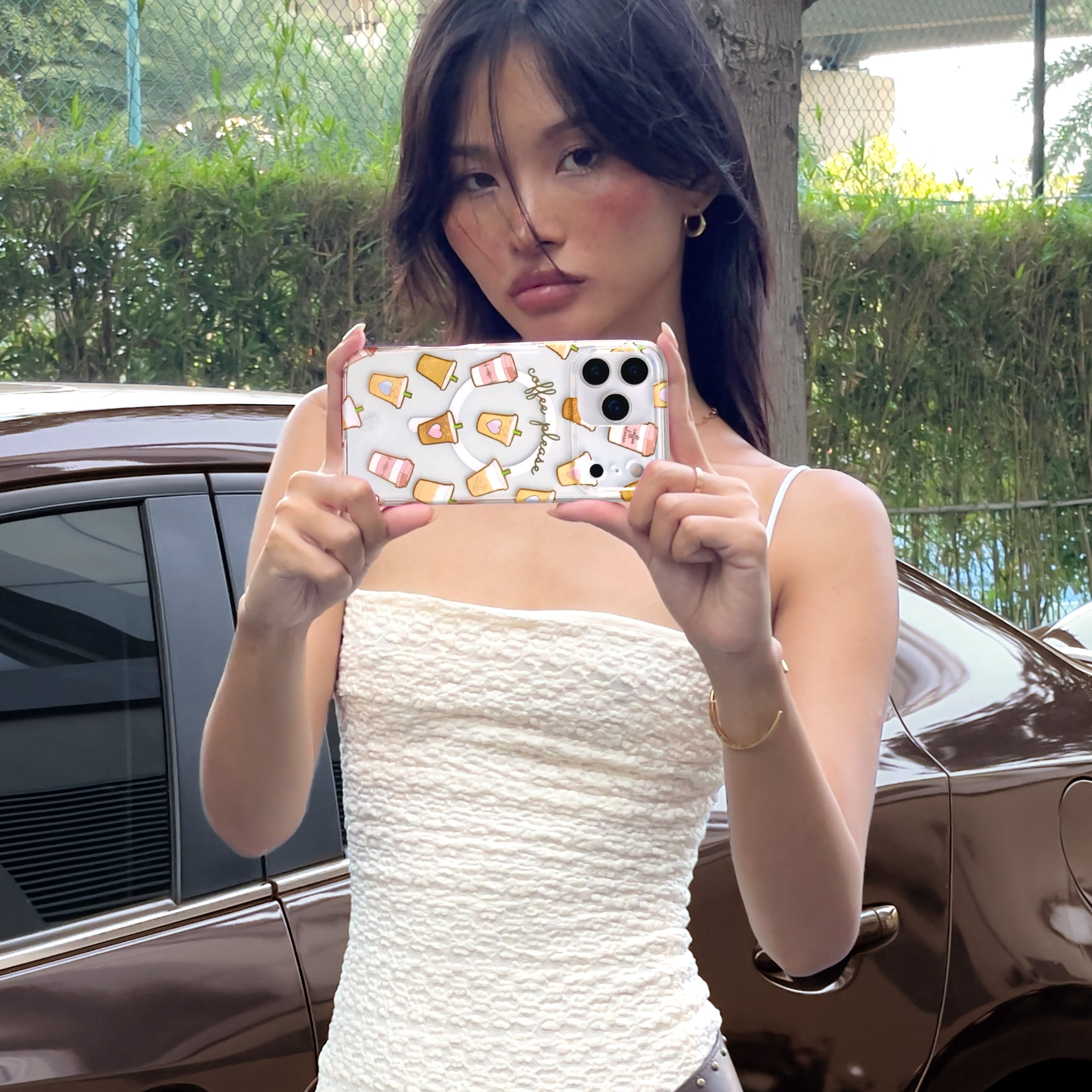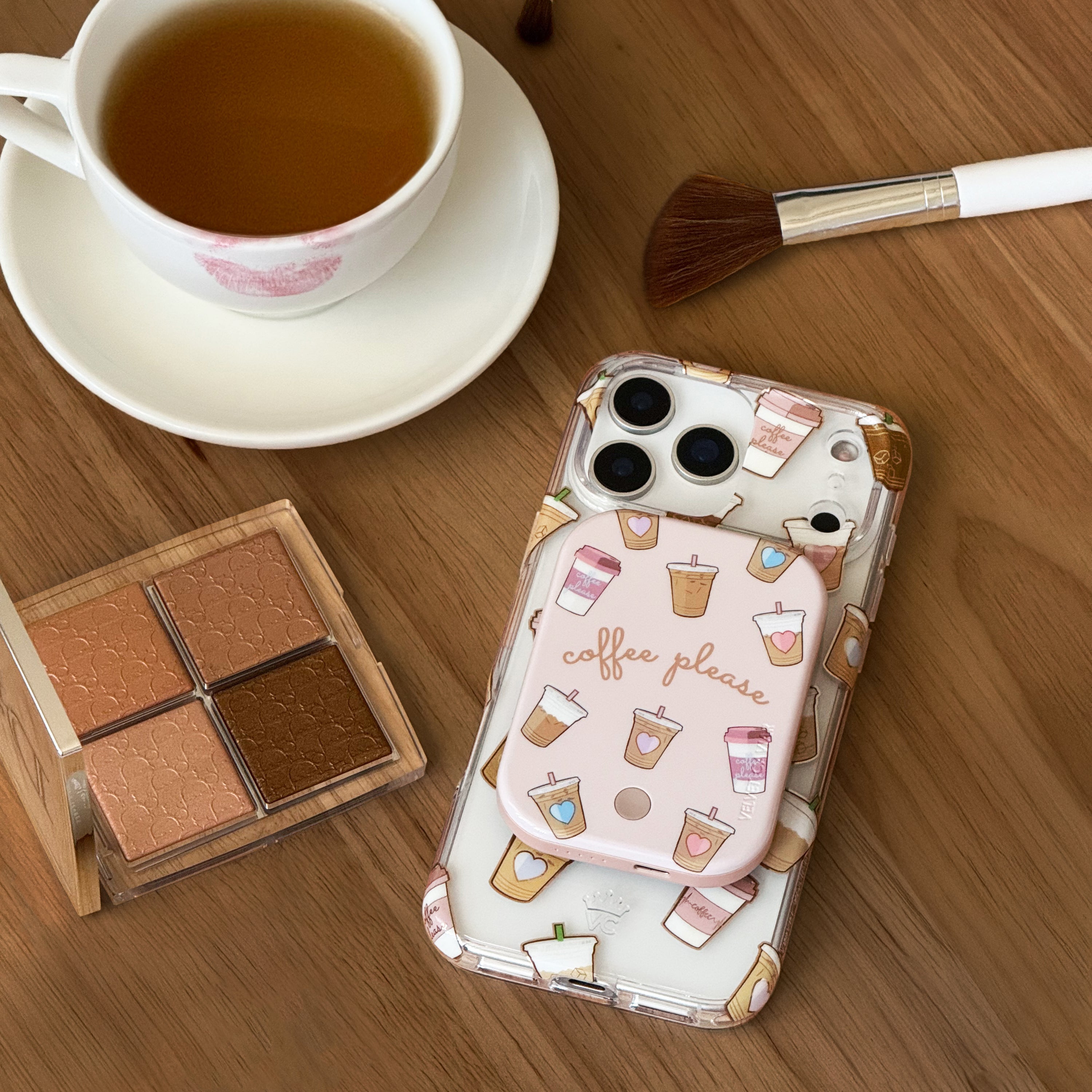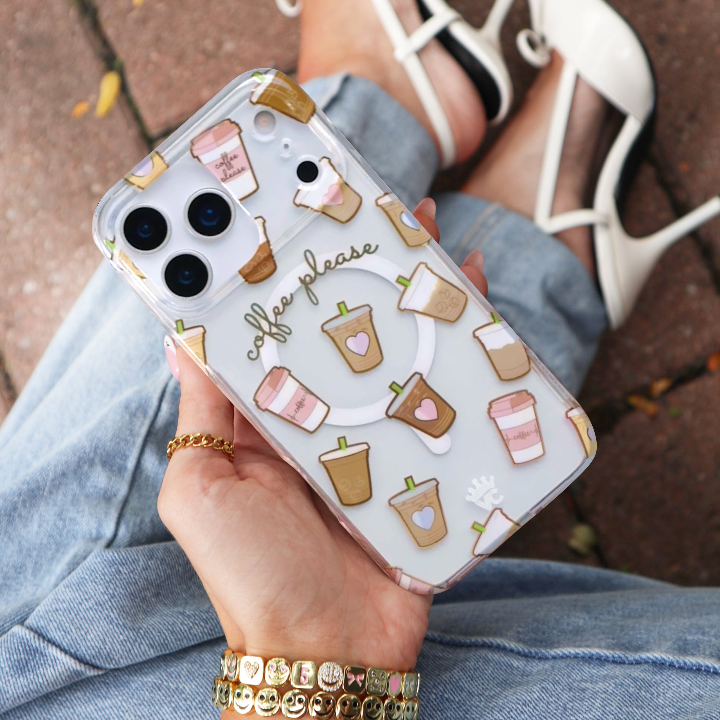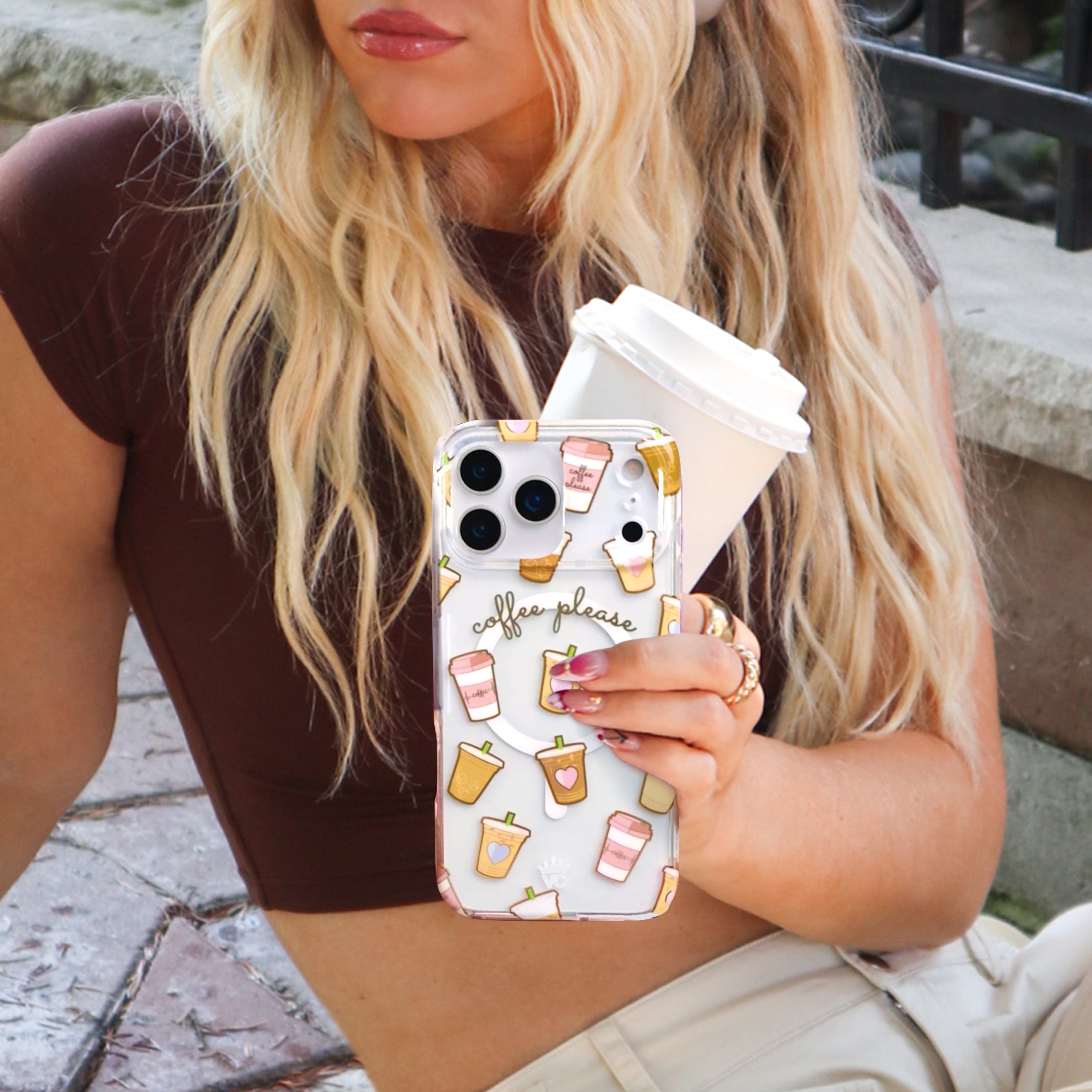 Don’t talk to me until I’ve had my… This protective, clear case has a super cute coffee pattern with gold chrome accents