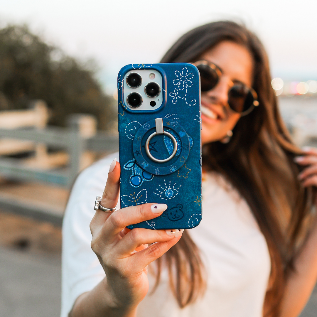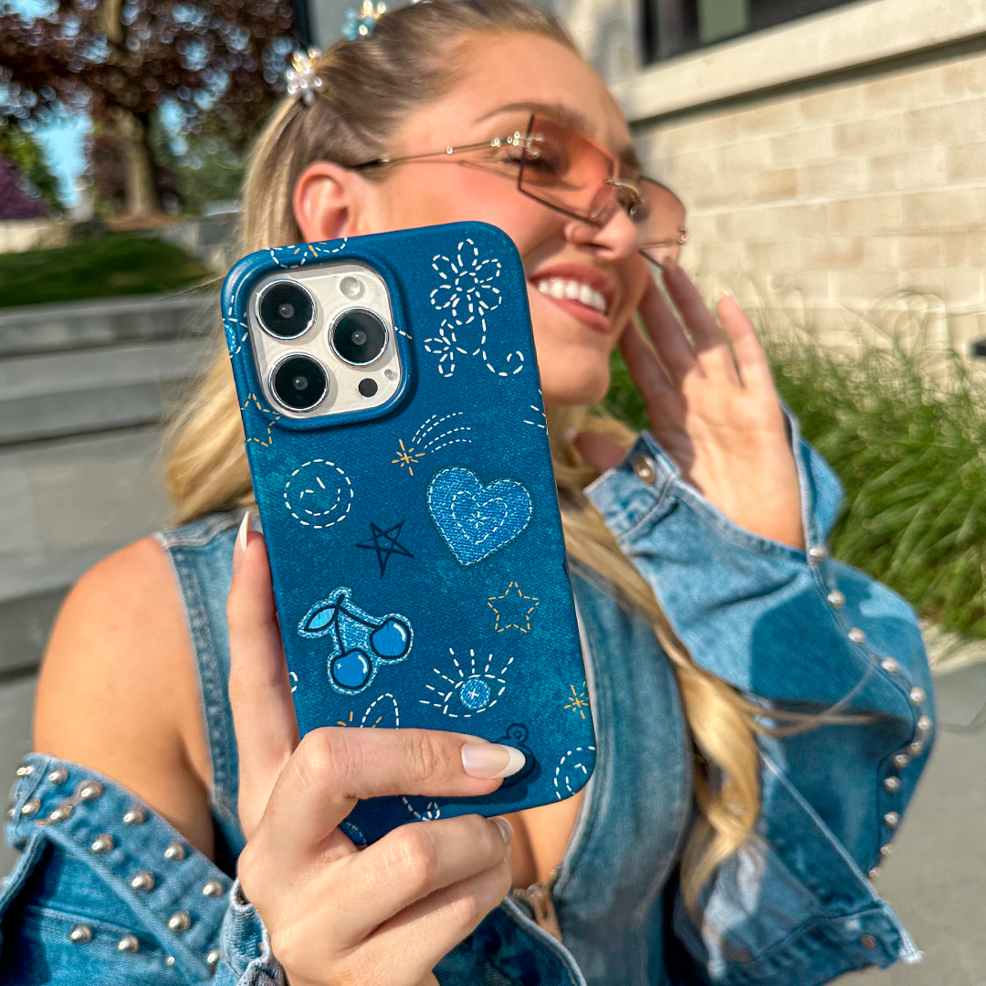 Darling in Denim! This Limited Edition western rodeo case features a soft-touch matte navy base with printed stitch details throughout.
