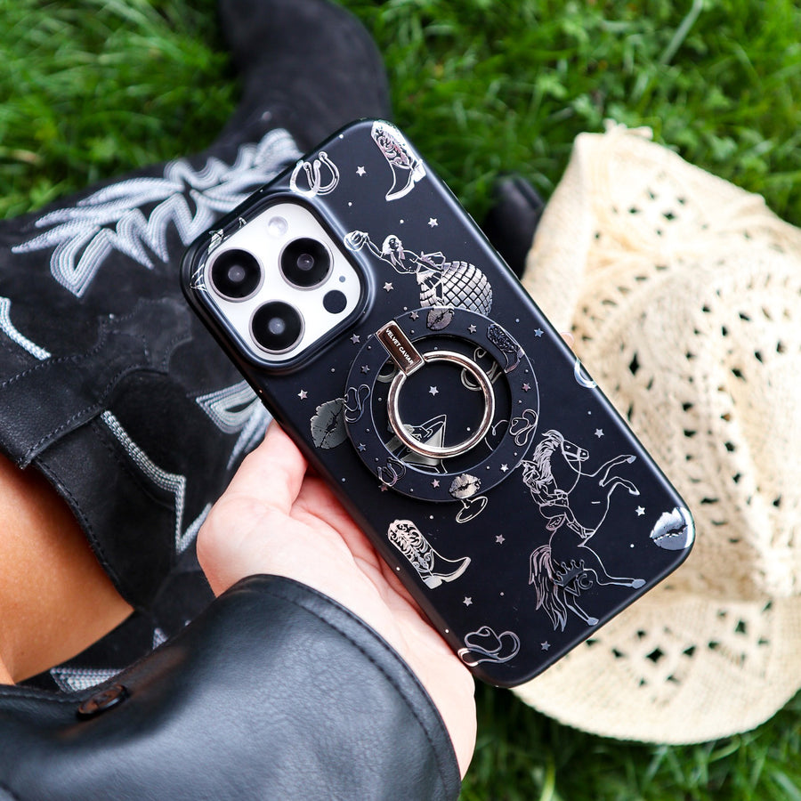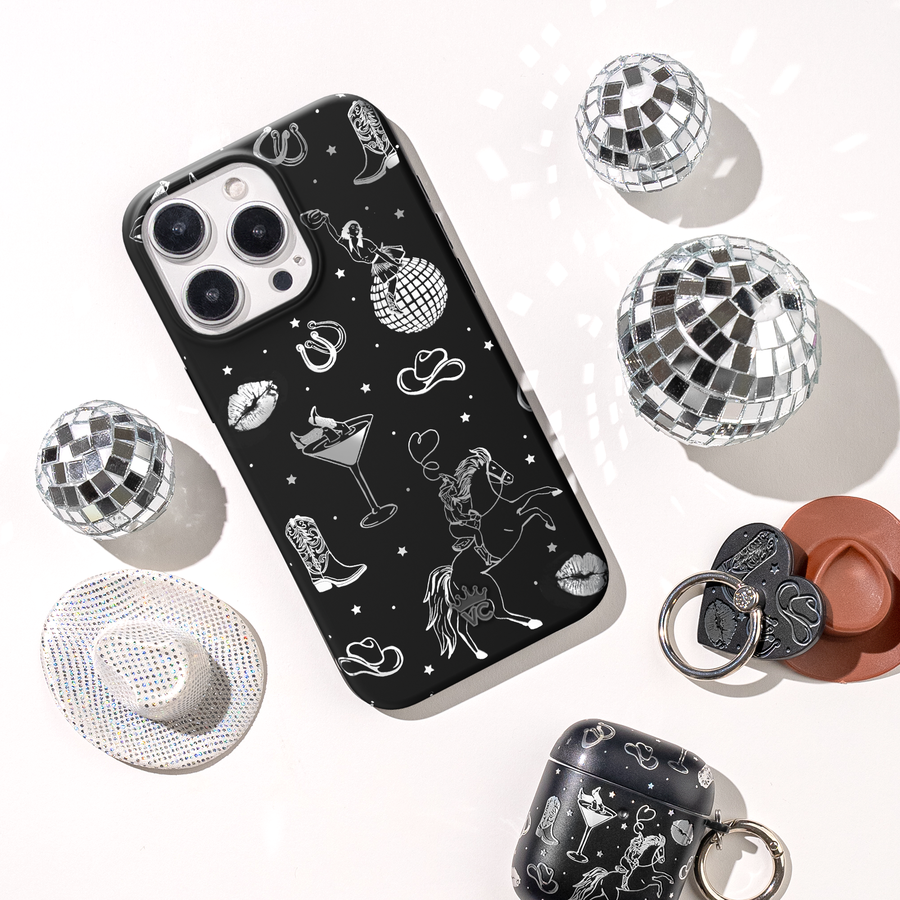 Queen of the night! This Limited Edition Case features a chrome cowboy hat, disco ball, boots, and martini glass all on a matte black base.