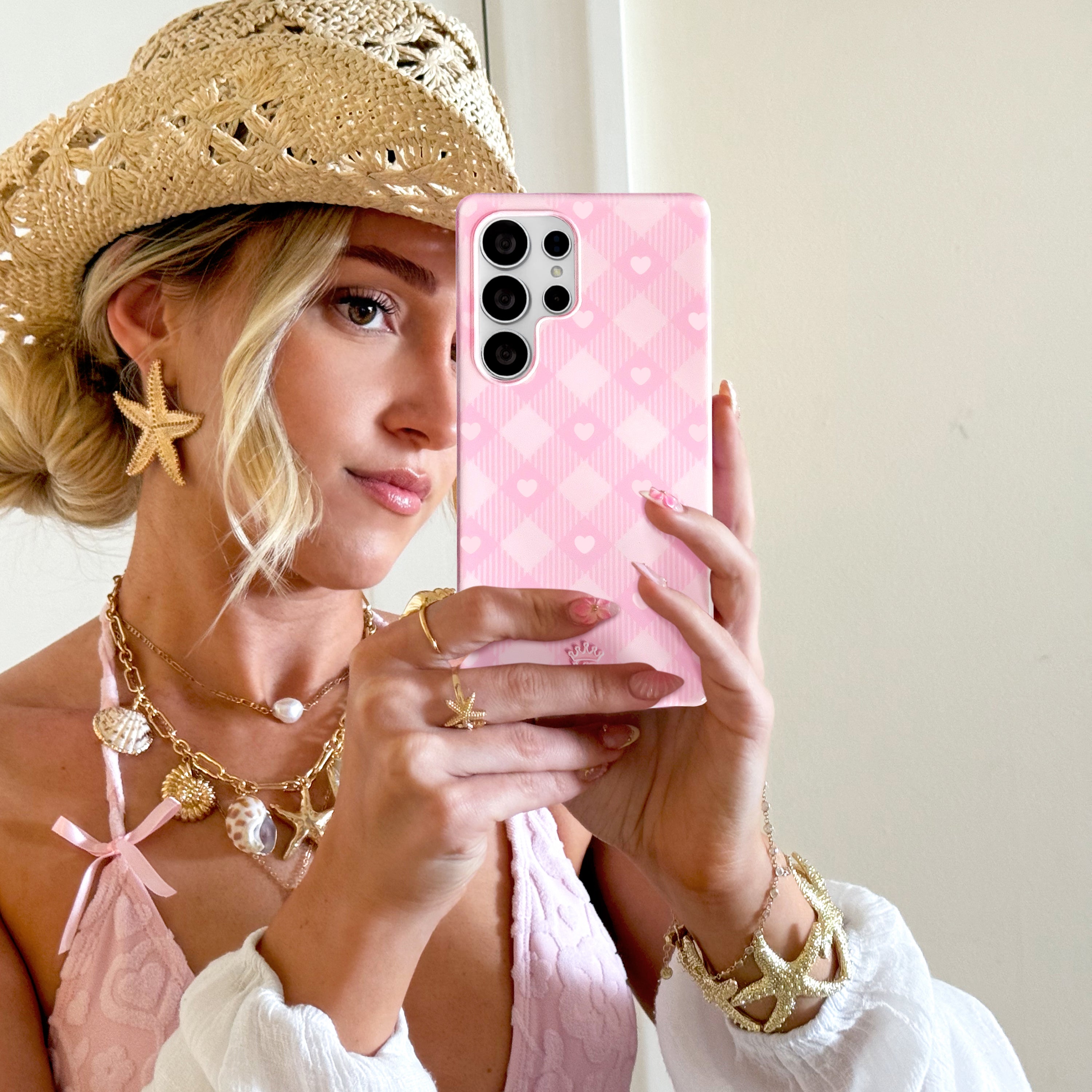 Picnic Pink! This cute protective phone case features a classic cool toned pink gingham print and baby pink hearts with a matching base and bumper.