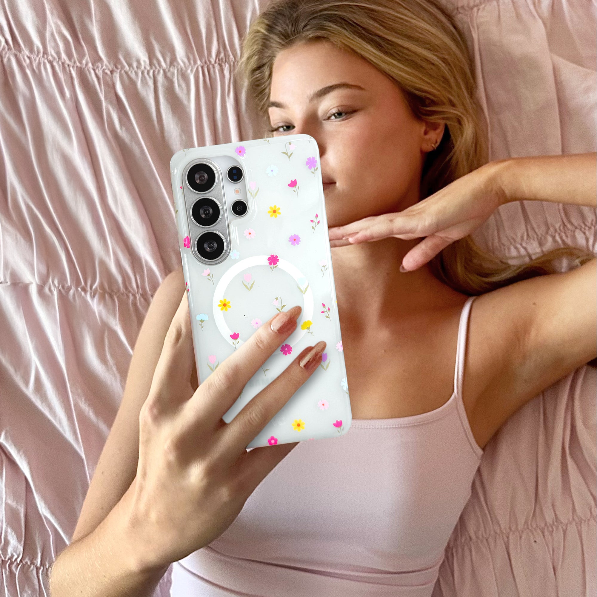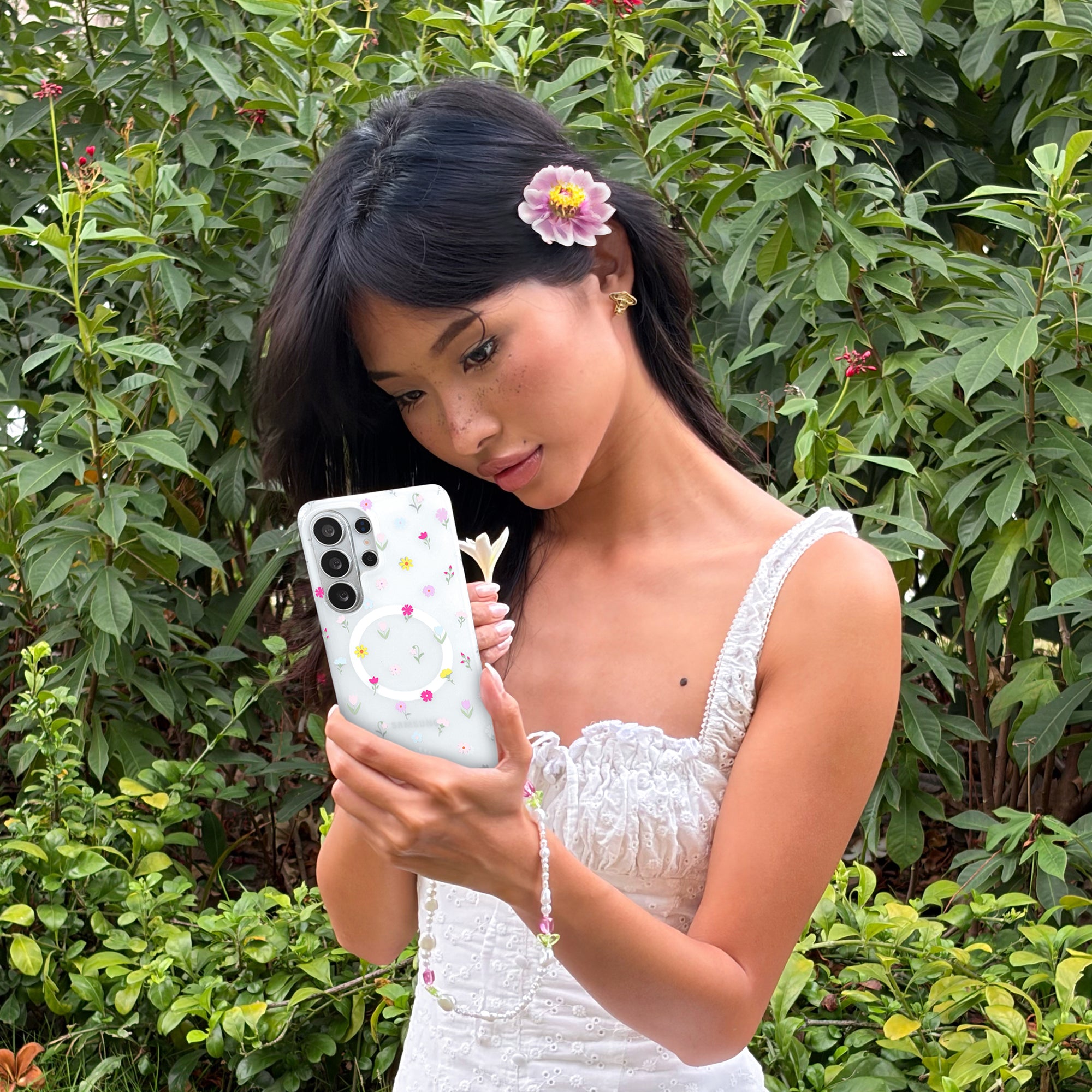 Dreaming of you! This protective phone case features colorful meadow florals on a milky white semi-transparent base.
