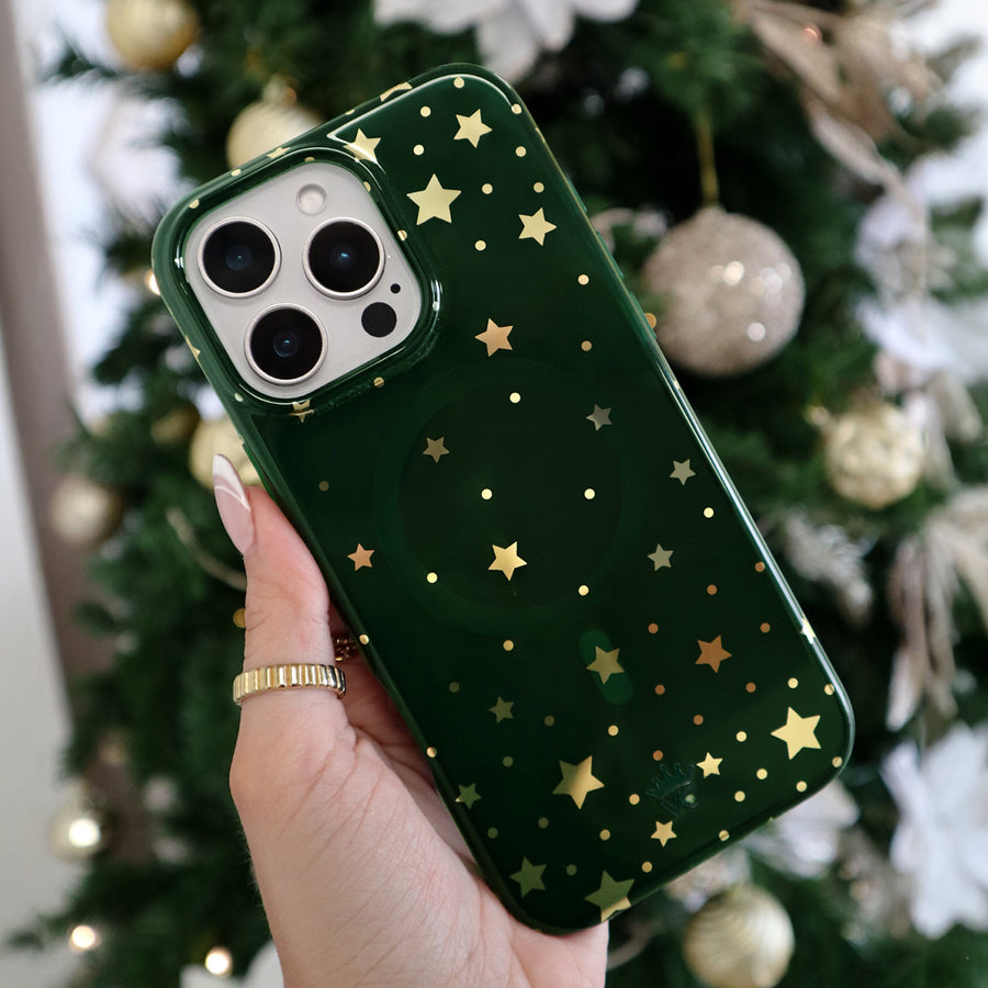 Happy Holidays! This MagSafe case features gold chrome stars on a transparent emerald green case. This case is part of our Limited Edition Christmas and Hanukkah Collection.