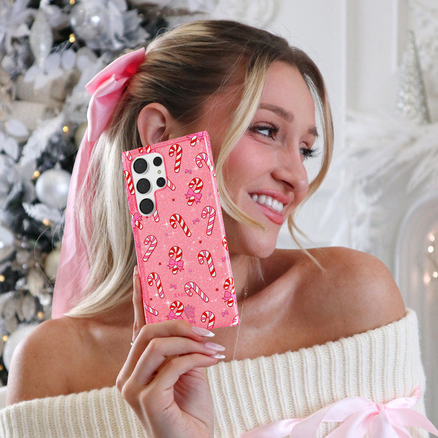 Happy Holidays! This protective transparent pink case has silver glitter sprinkled into the base and bumper and is covered in adorable peppermint candy canes and pink bows. This case is part of our Limited Edition Christmas and Hanukkah Collection.