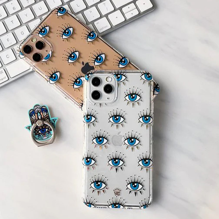 This protective clear case is covered in hand-drawn eye pattern with shiny chrome effects to block out all the negative vibes!