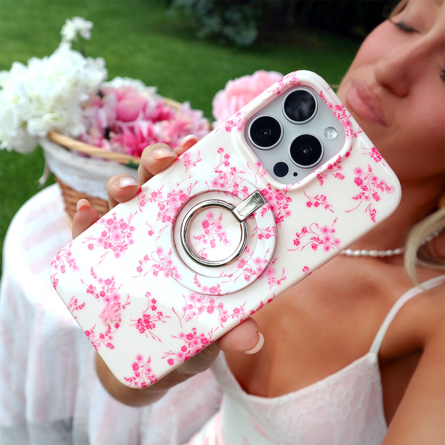 Coquette Core! This Limited Edition MagSafe case features a ditsy baby pink floral pattern on a glossy white base.