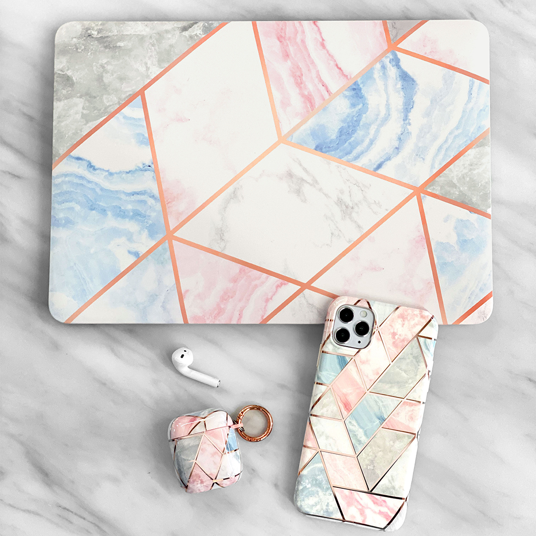 Featuring a geometric pastel marble pattern, outlined in rose gold chrome along with a matching blush pink bumper.