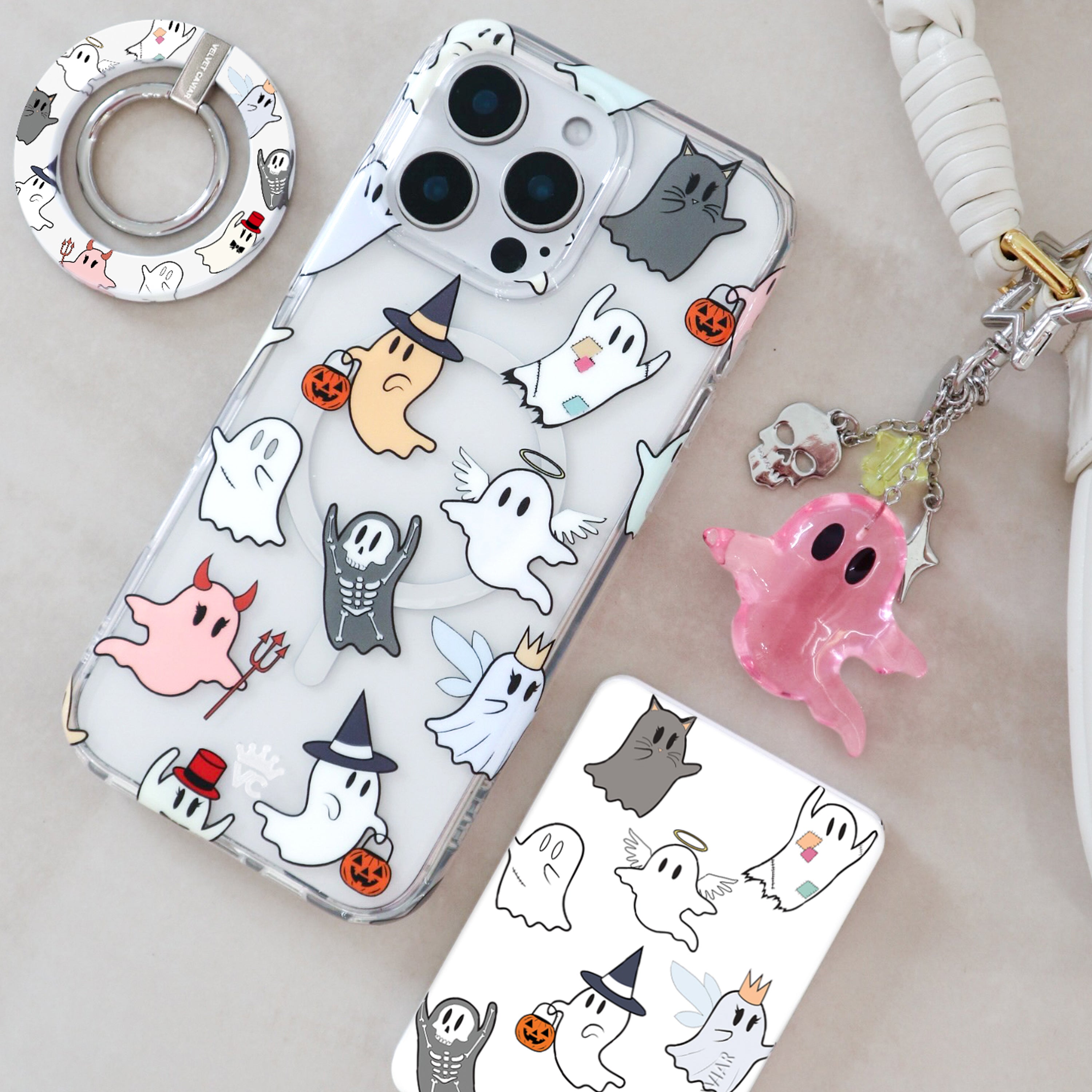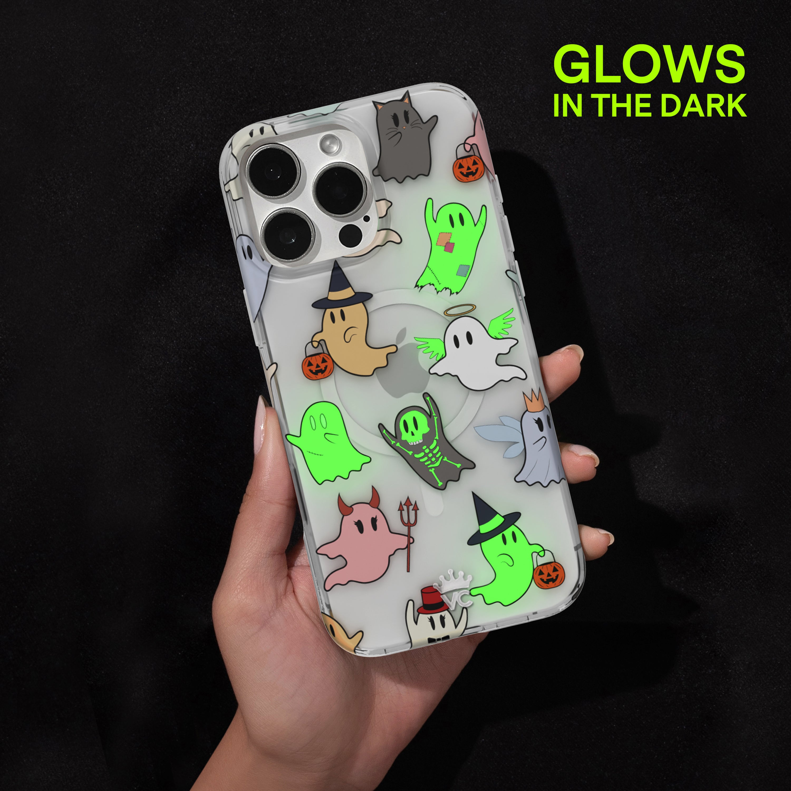 Happy Halloween! This glow in the dark MagSafe case features our iconic friendly ghosts now in cute classic halloween costumes.