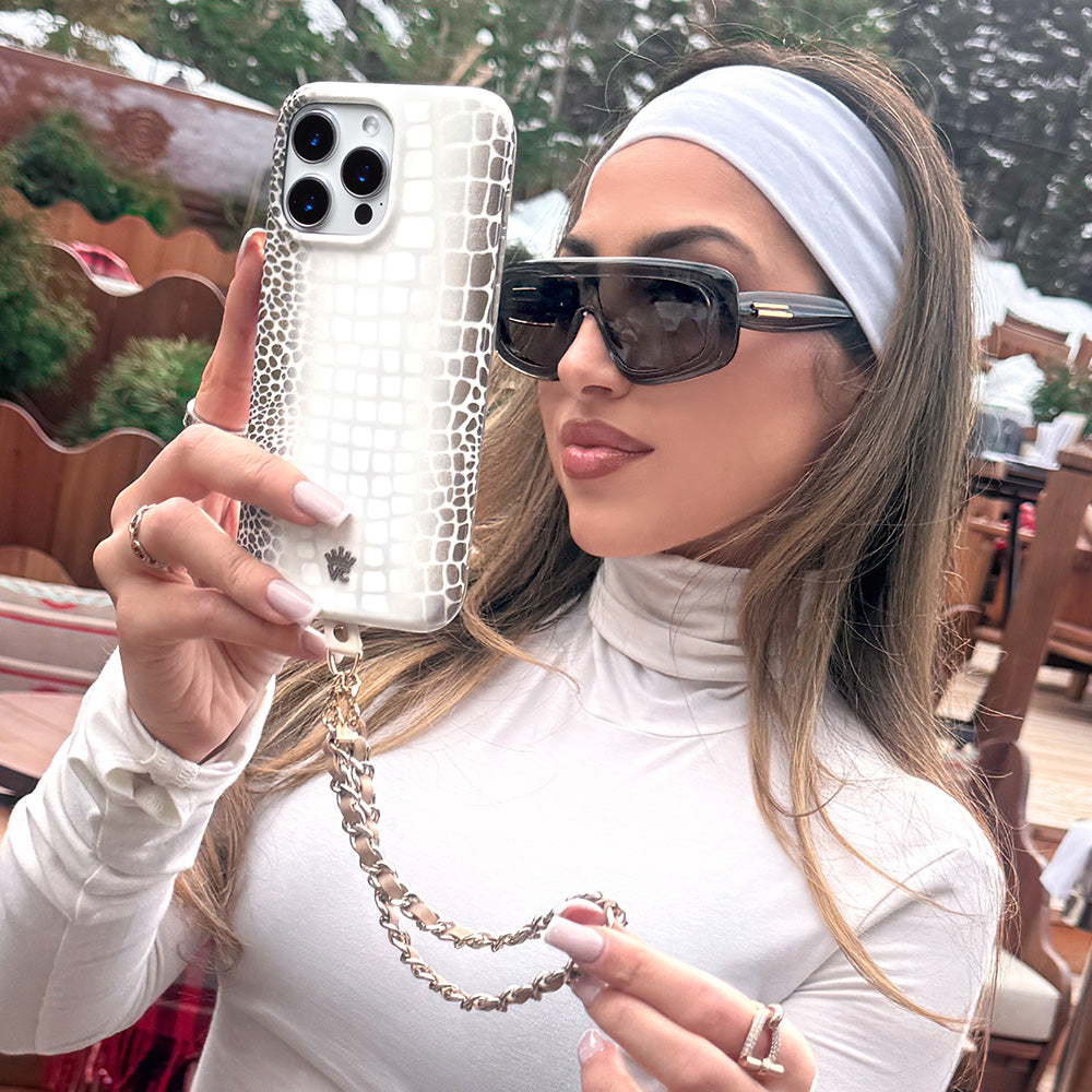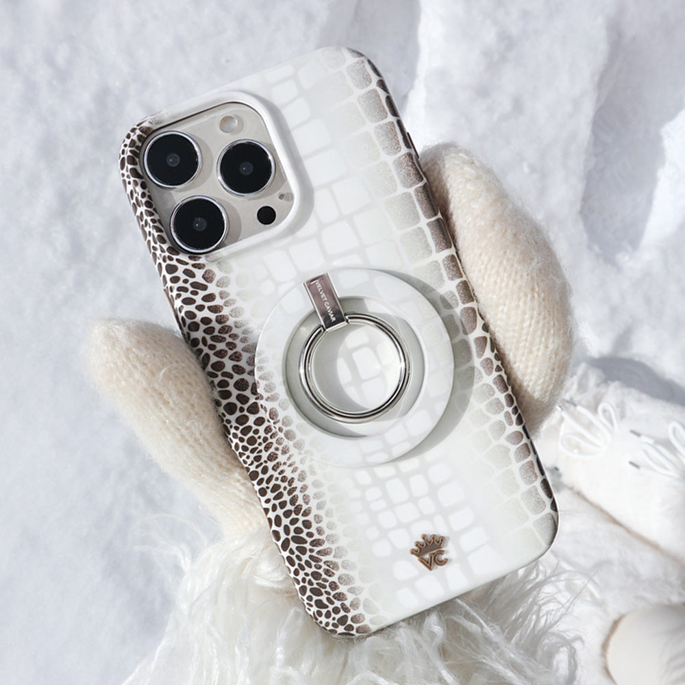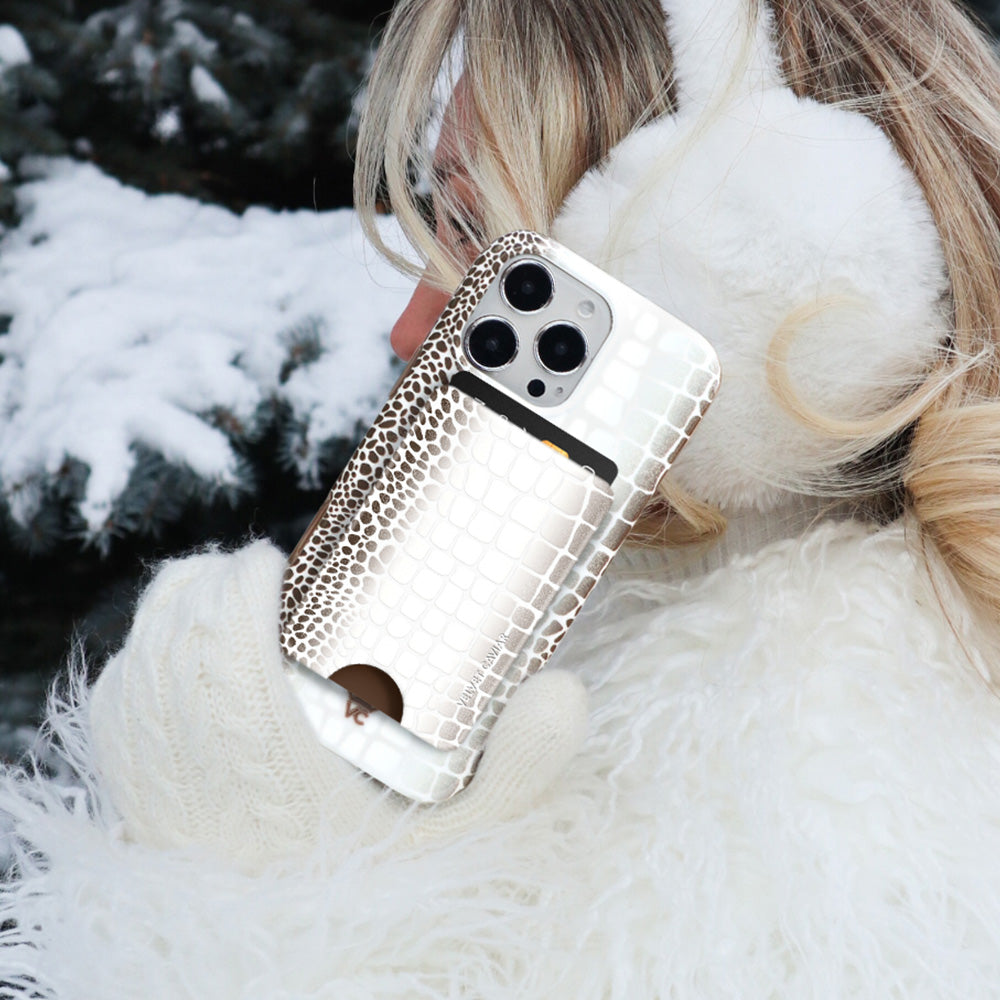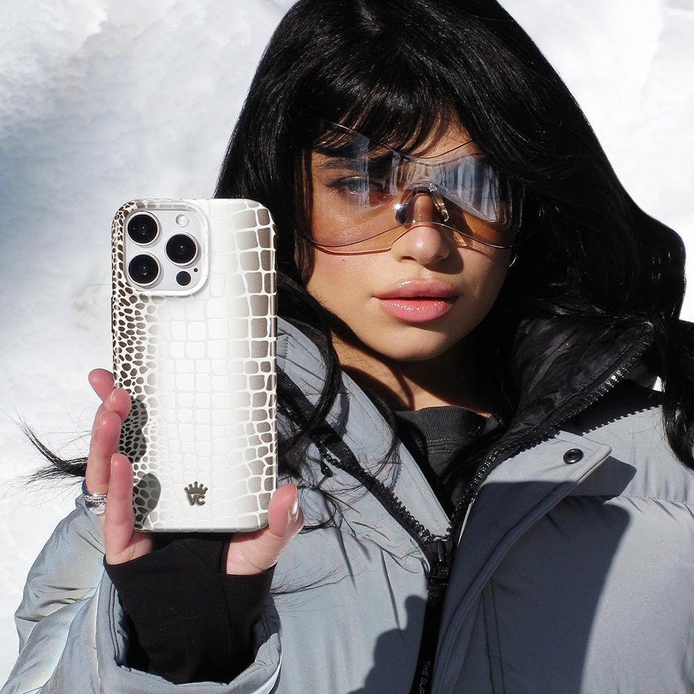 Limited Edition and Luxurious! This MagSafe case features a glossy white to taupe ombré crocodile pattern on a monochromatic matte white base with a contrasting taupe bumper.
