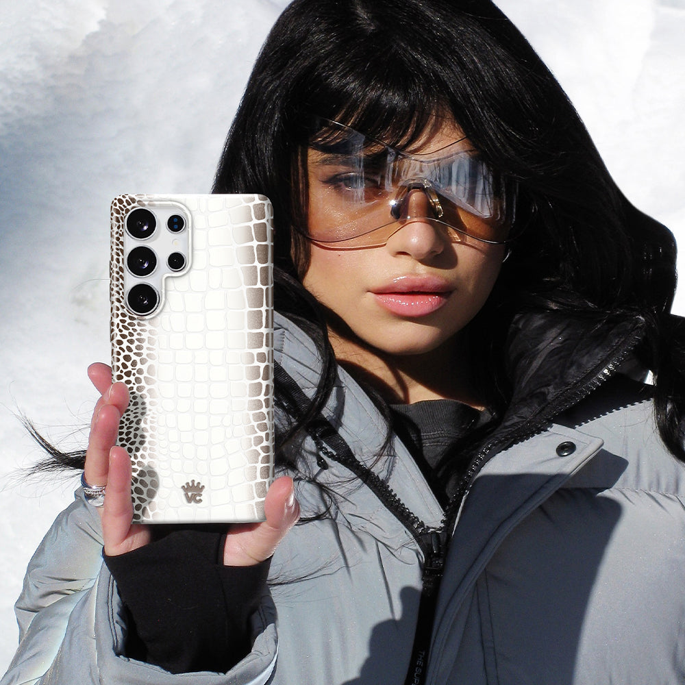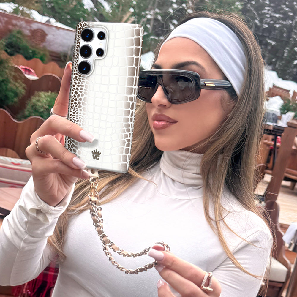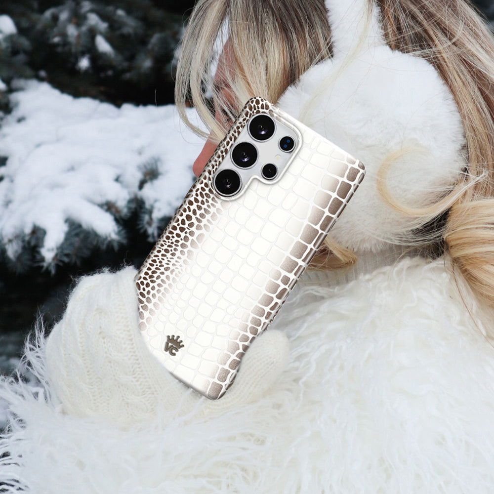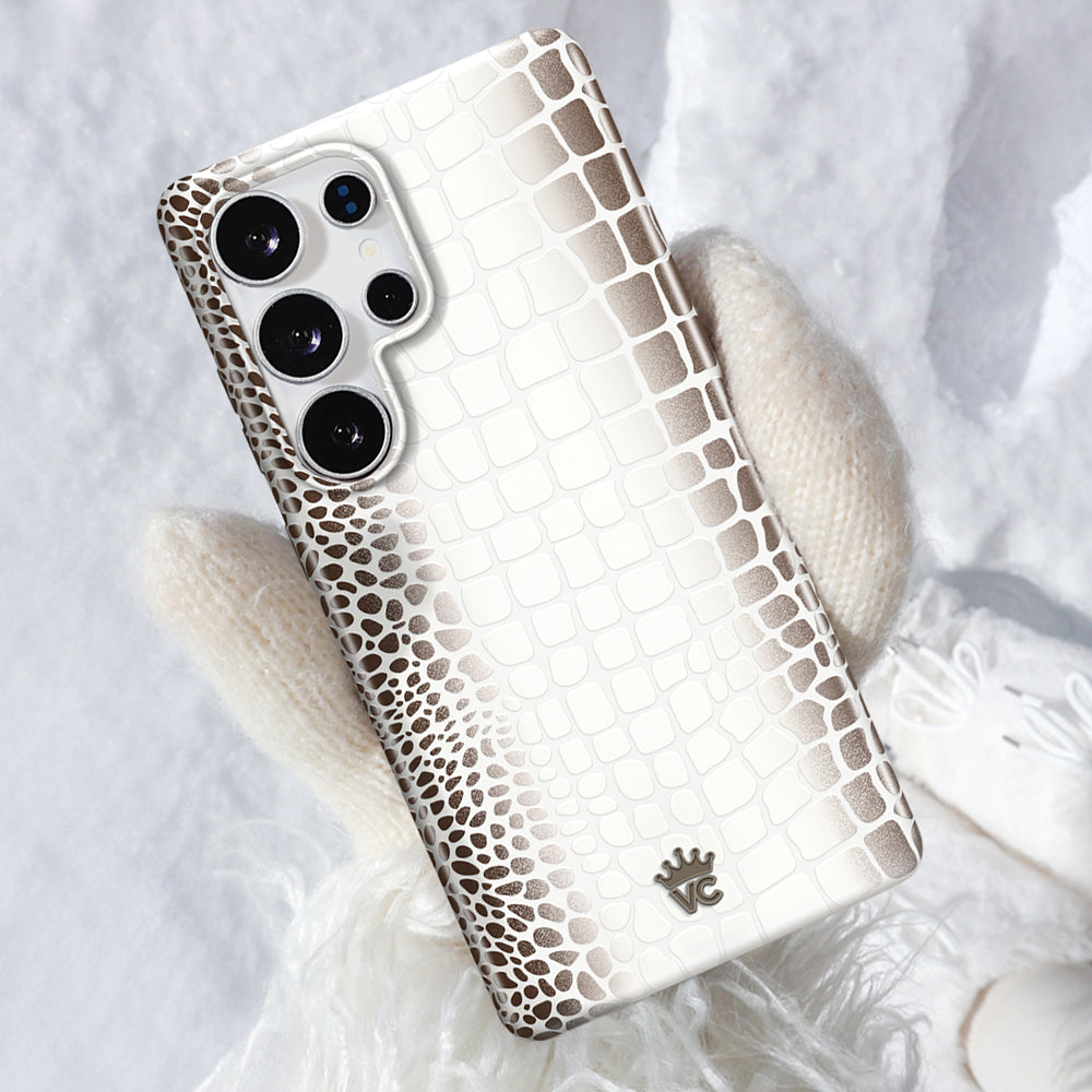 Limited Edition and Luxurious! This protective case features a glossy white to taupe ombré crocodile pattern on a monochromatic matte white base with a contrasting taupe bumper.
