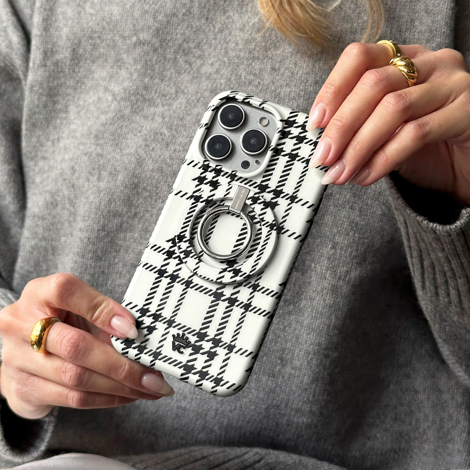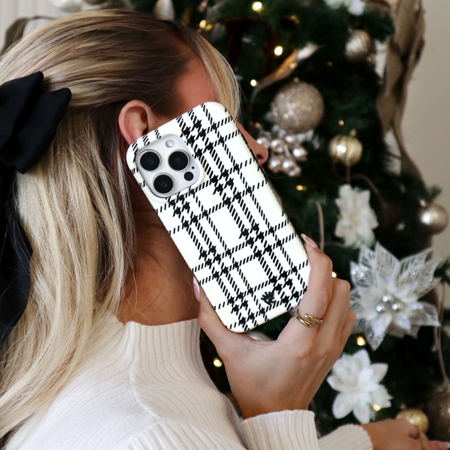 Happy Holidays! This MagSafe case features a classic black and white houndstooth print with a contrasting black bumper. This case is part of our Limited Edition Christmas and Hanukkah Collection.