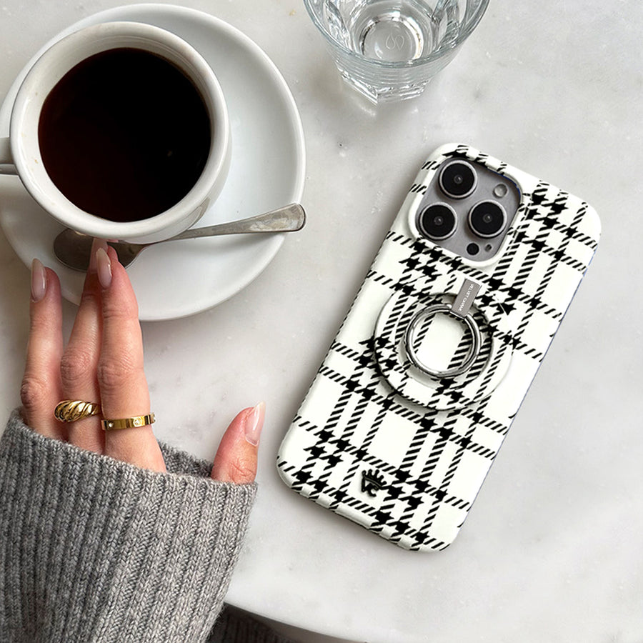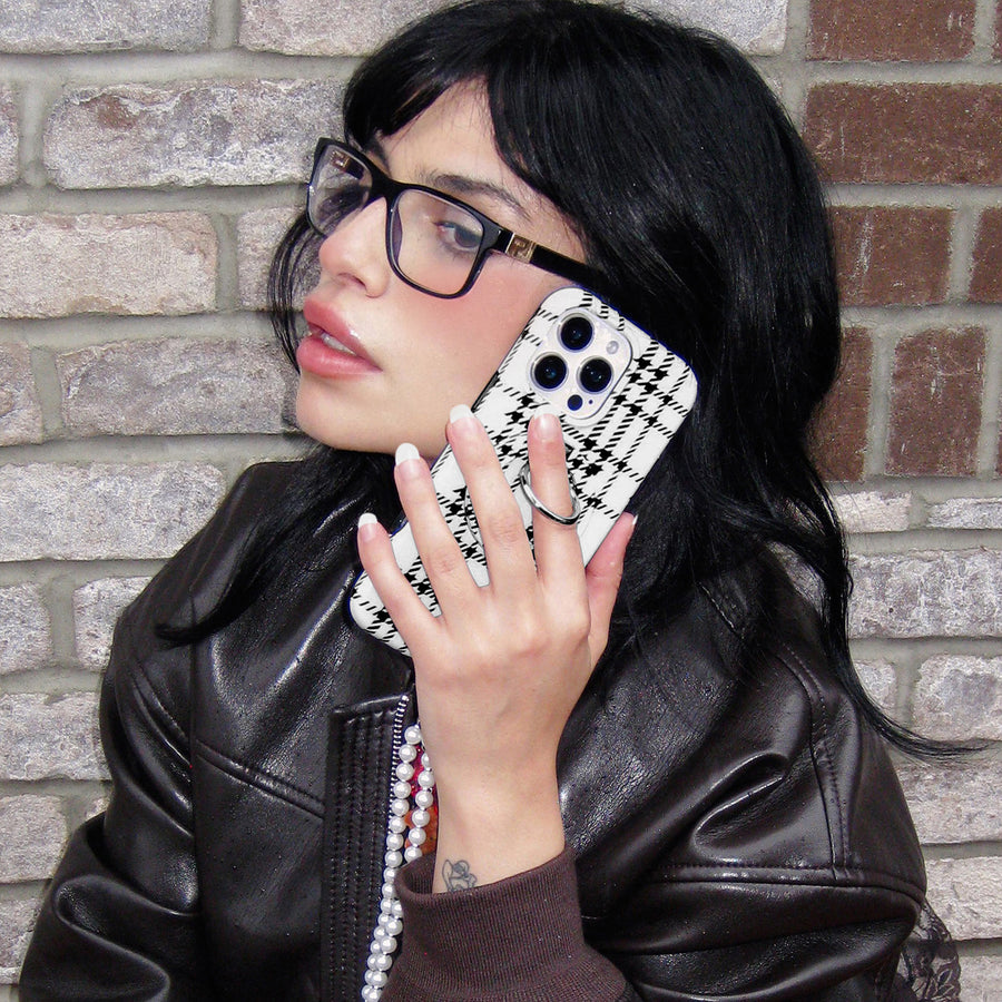 Happy Holidays! This MagSafe case features a classic black and white houndstooth print with a contrasting black bumper. This case is part of our Limited Edition Christmas and Hanukkah Collection.