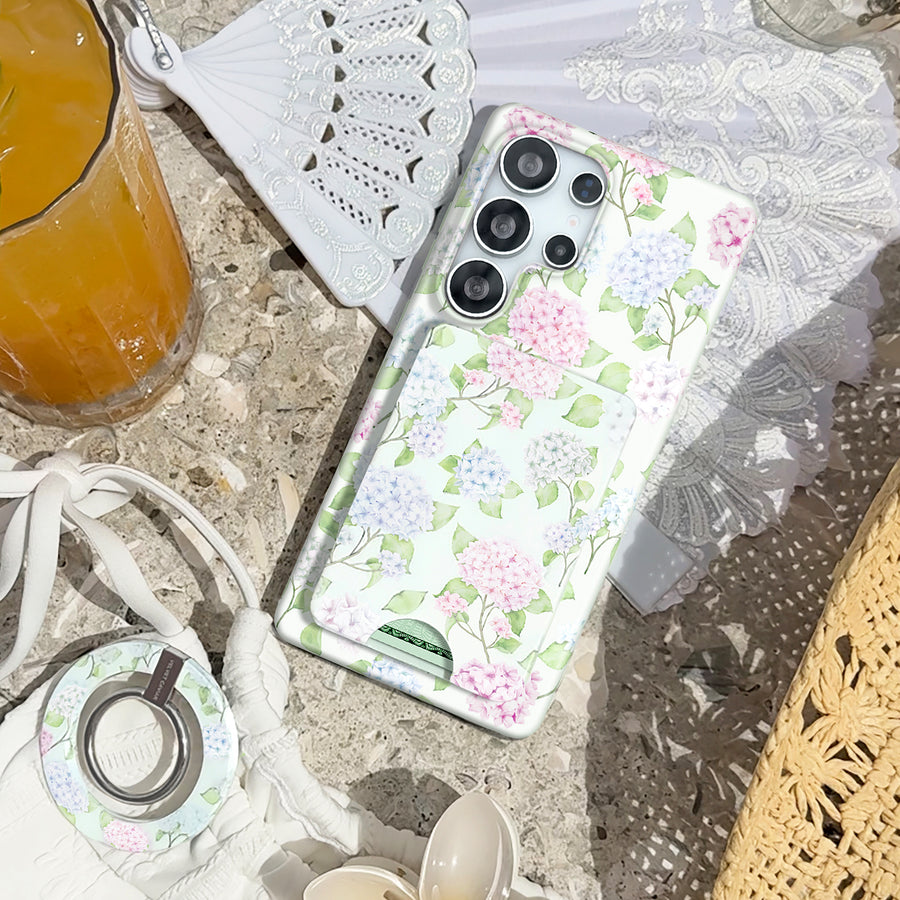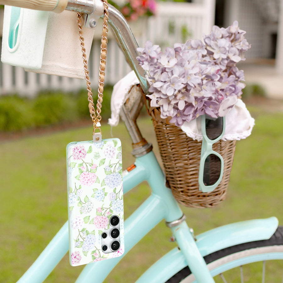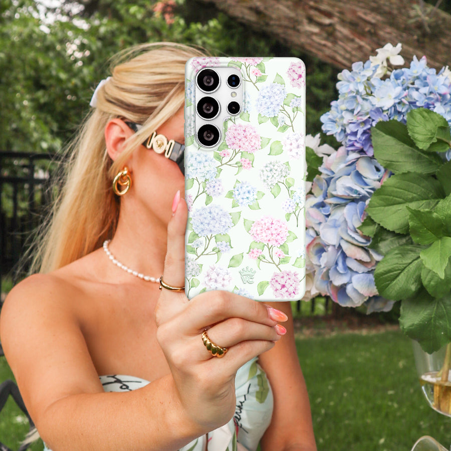Bring the beach to you! This glossy protective phone case features classic coastal hydrangea florals on a light minty base.