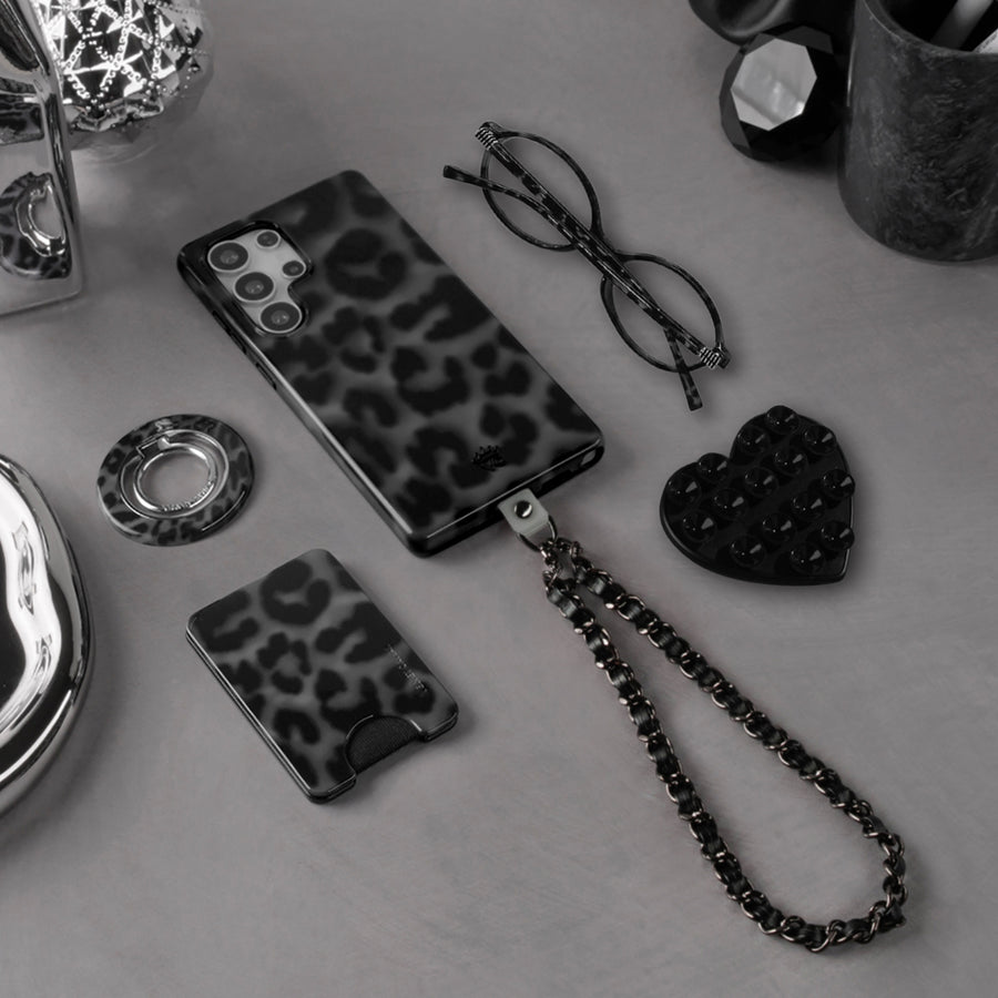 Instant It Girl! Turn heads in this glossy protective case featuring black leopard spots on a dimensional cool grey base.