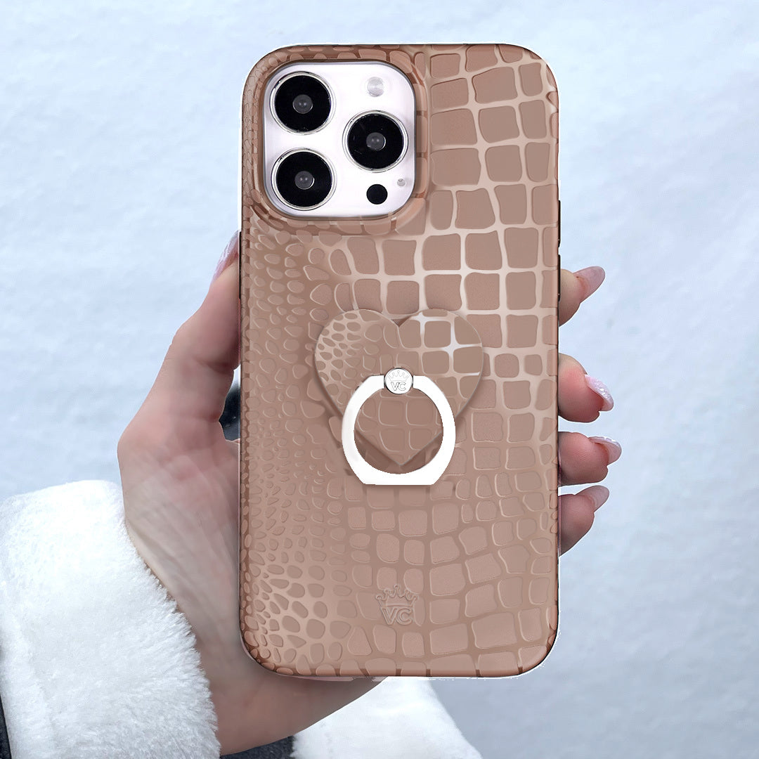 Classic and Luxe. This ultra-protective case features a glossy embossed crocodile pattern on a monochromatic matte khaki base.