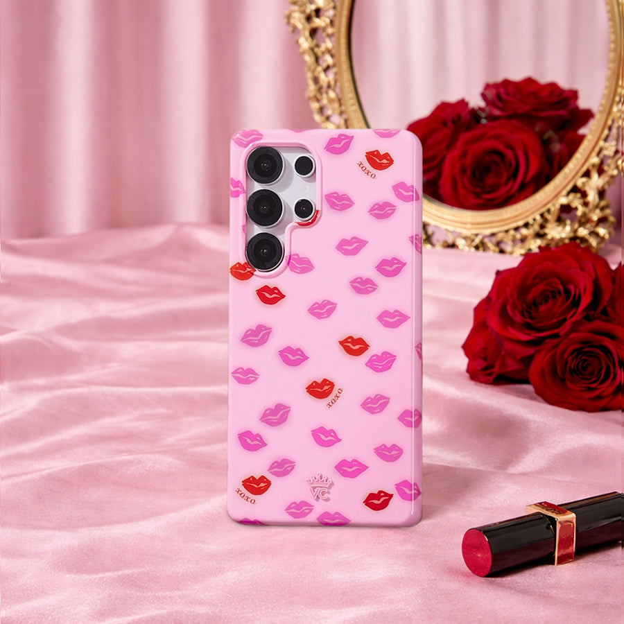 Kiss Kiss! This glossy protective case features soft focus red and pink lipstick kisses on a cool pink base.