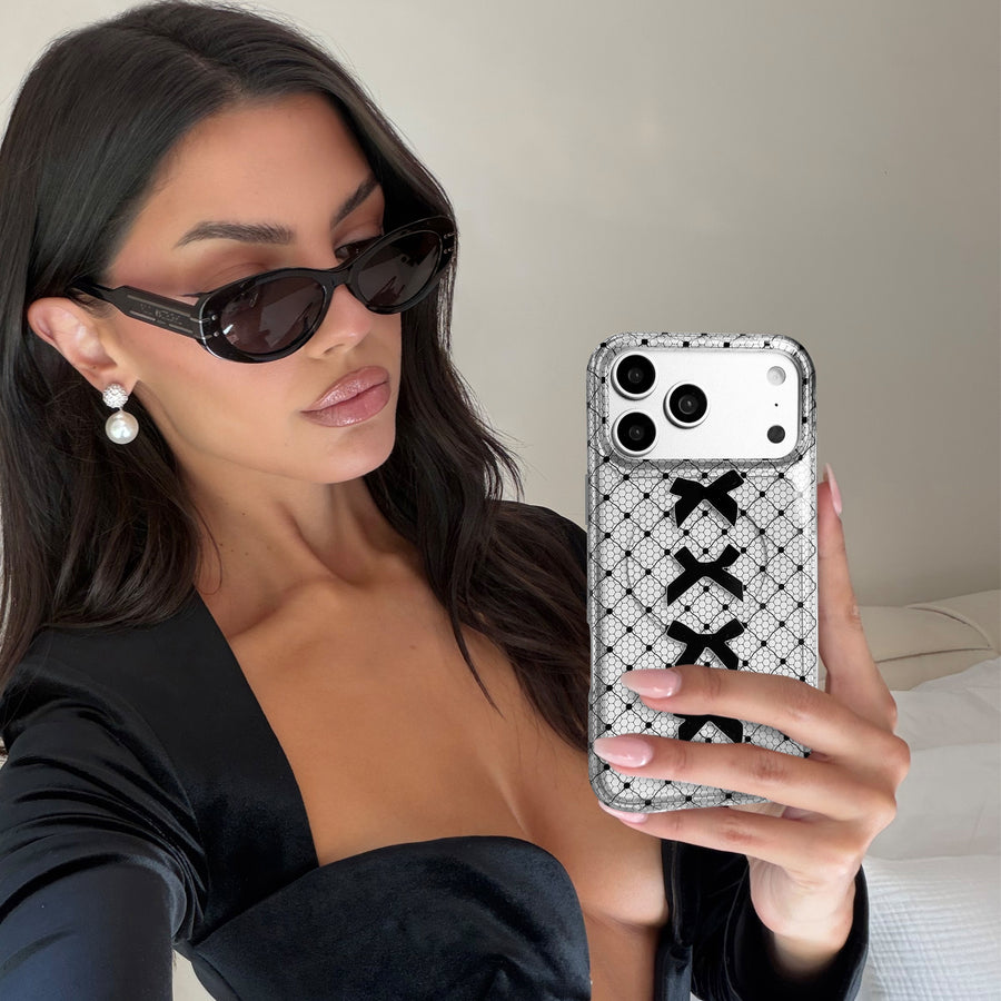 Lace Me Up! This Limited Edition MagSafe case features a clear base with glossy black lace and bow details.
