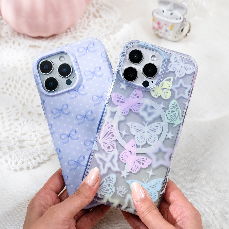 Blissful in blue! This MagSafe case features delicate watercolor blue ribbons on a pale blue base with white polka dots throughout.