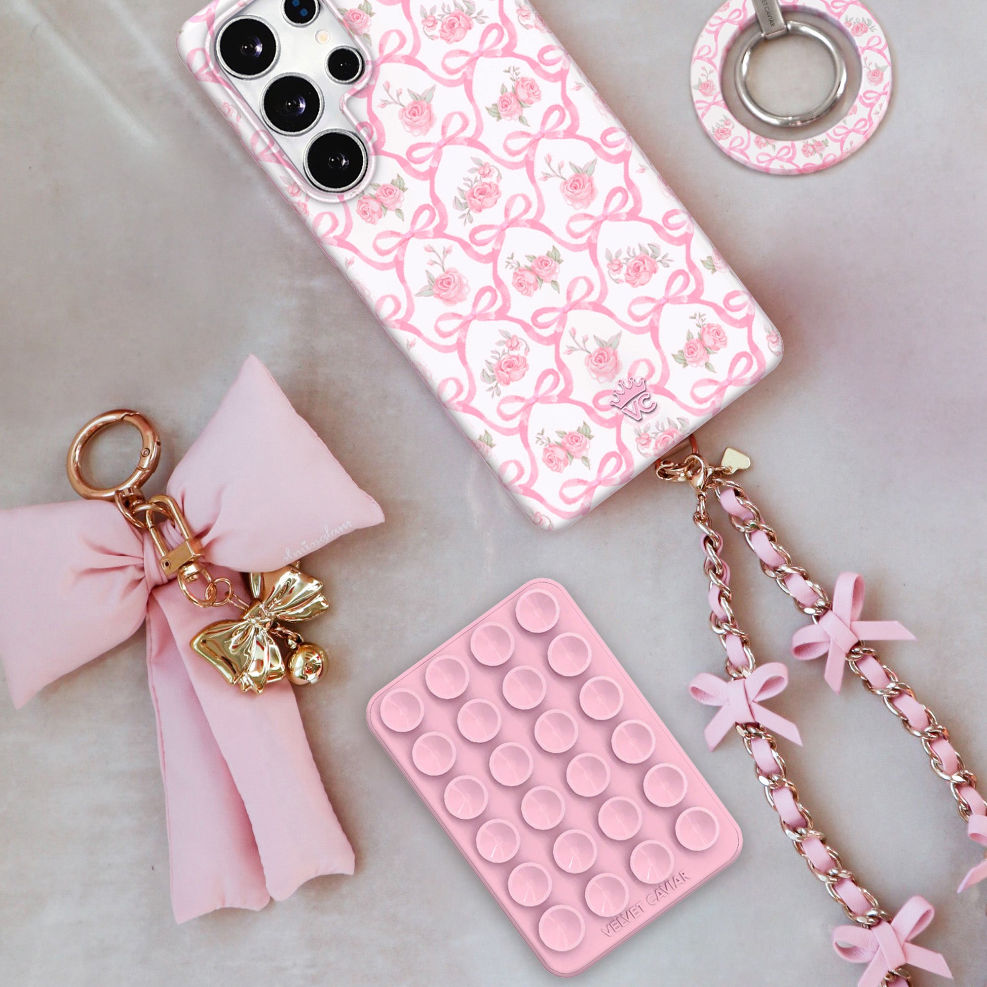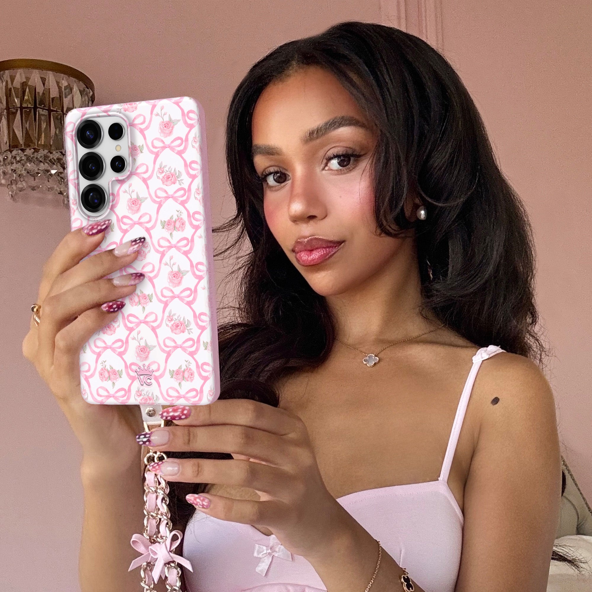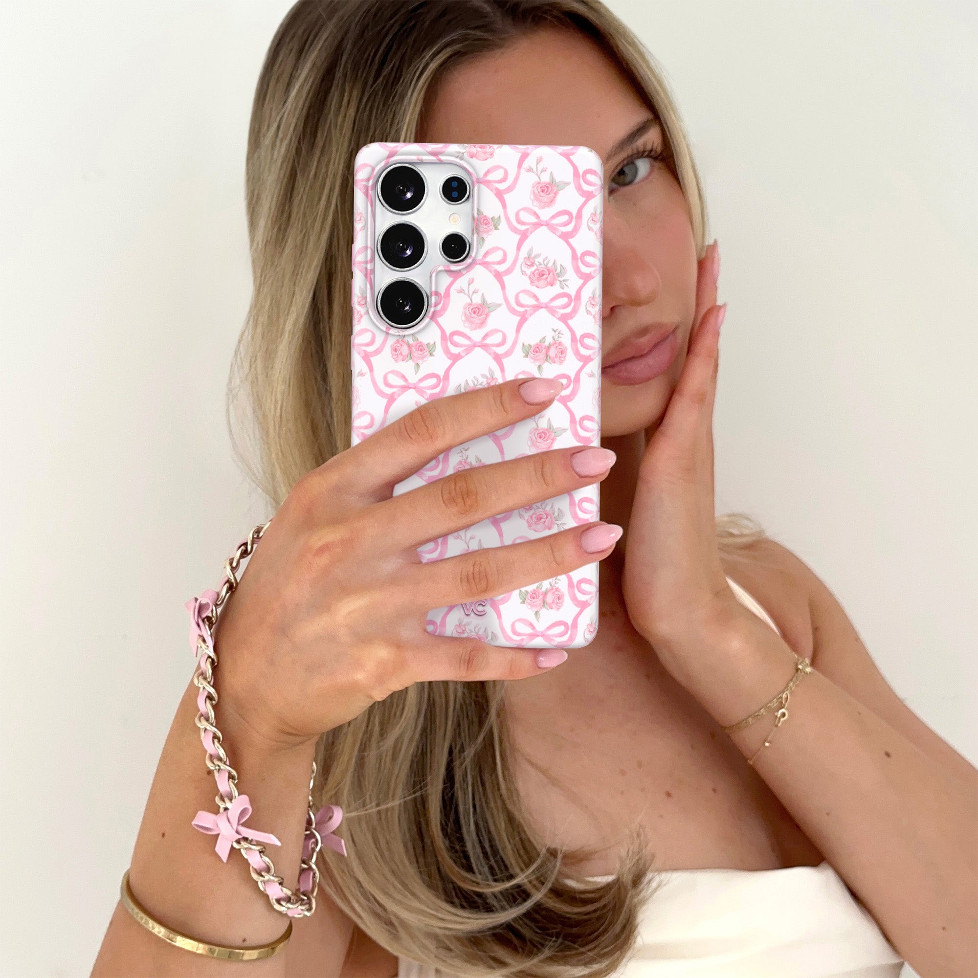 Pretty in pink! This protective phone case features romantic baby pink roses framed with pink ribbon bows in a trellis pattern on a glossy white base with a light pink bumper.