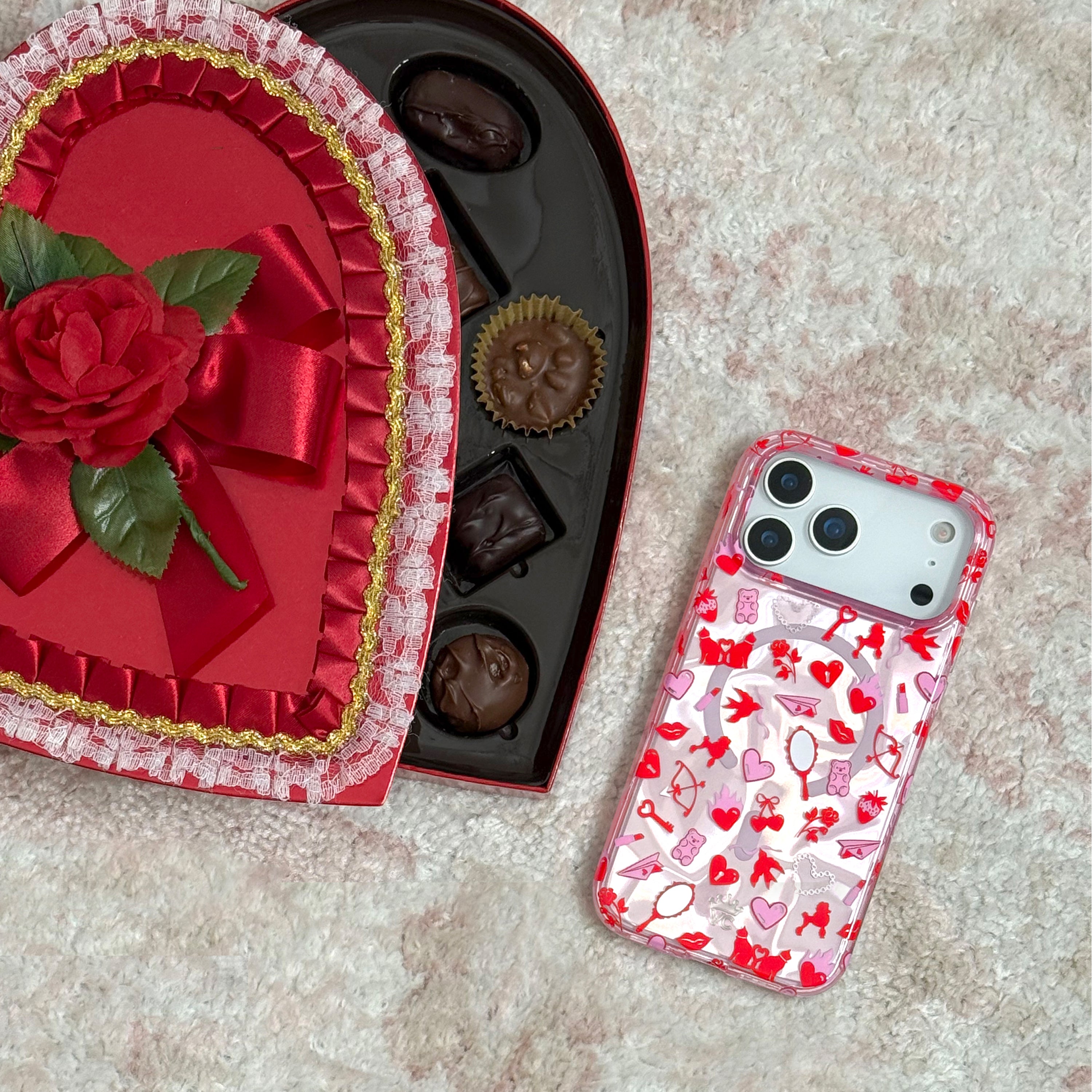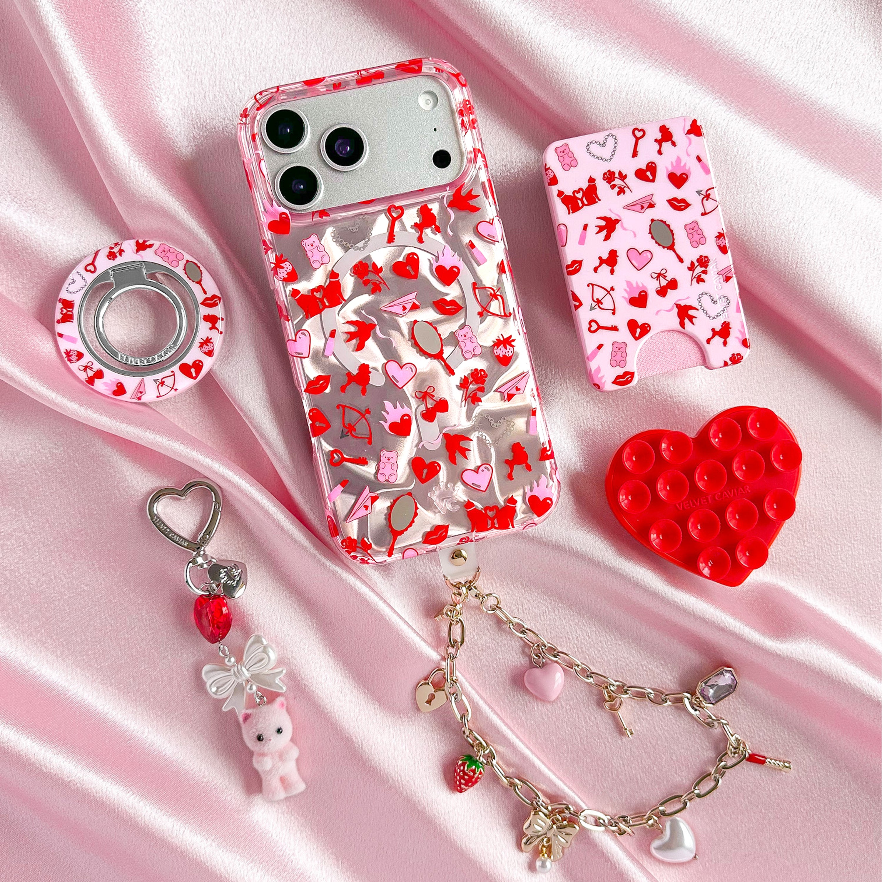 Fall in love! This stunning MagSafe phone case features red and pink hearts, kisses, Valentine's motifs, and chrome mirrors on a pinky silver base with a holographic wave effect throughout.