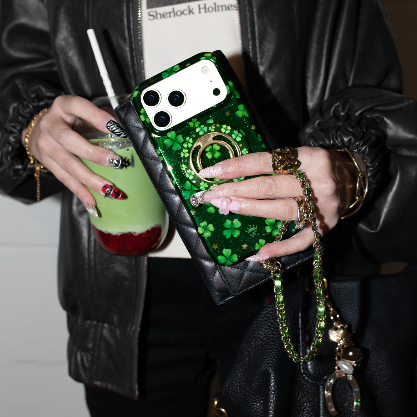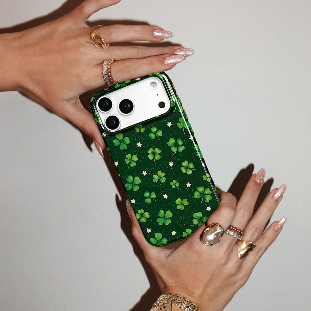 Happy St. Patrick's Day! This Limited Edition MagSafe case features lucky four leaf clovers and gold chrome stars on a transparent emerald green base with green glitter sprinkled into the base and bumper.