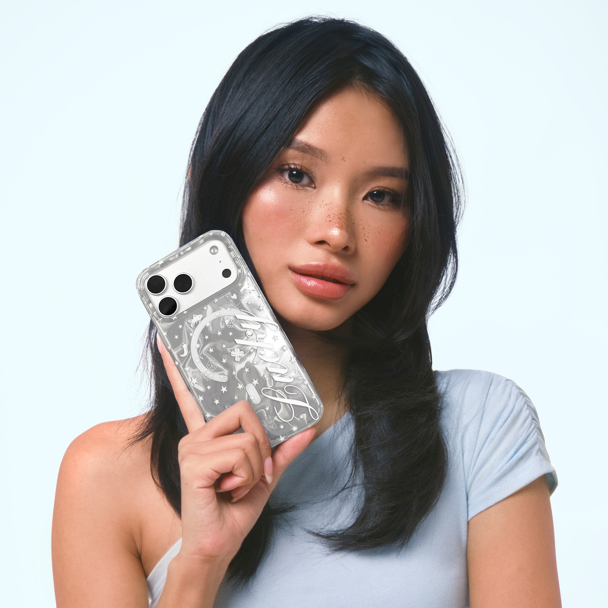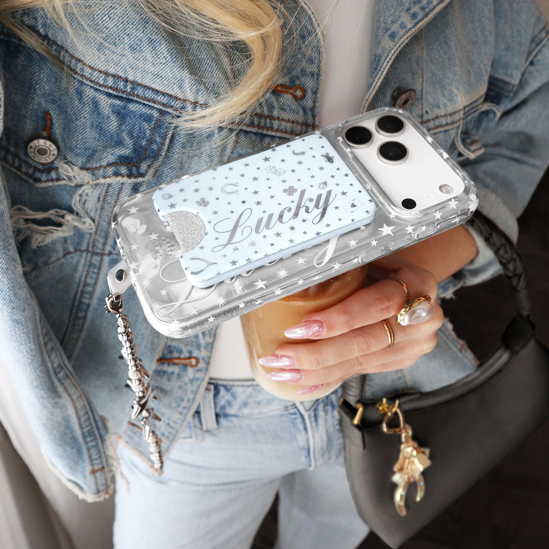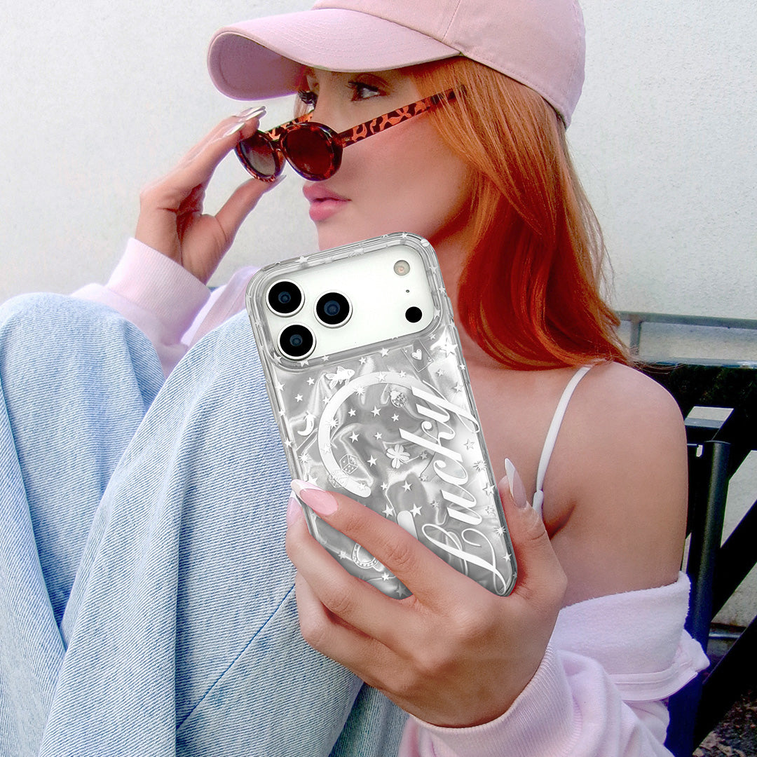 Lucky Girl! This stunning MagSafe phone case features 'Lucky' in white script along with white stars, ladybugs, dice, and more on a silver base with a holographic wave effect throughout.
