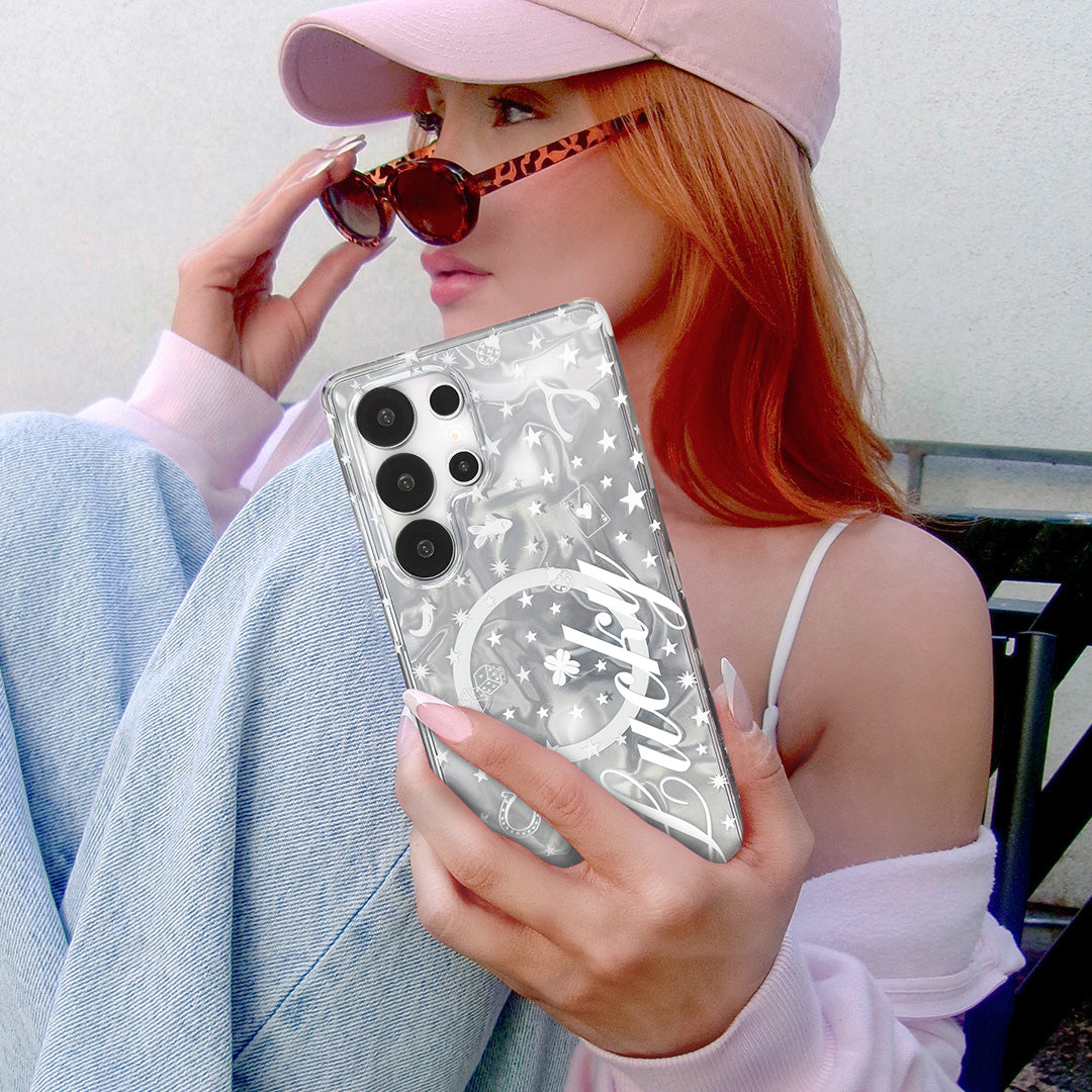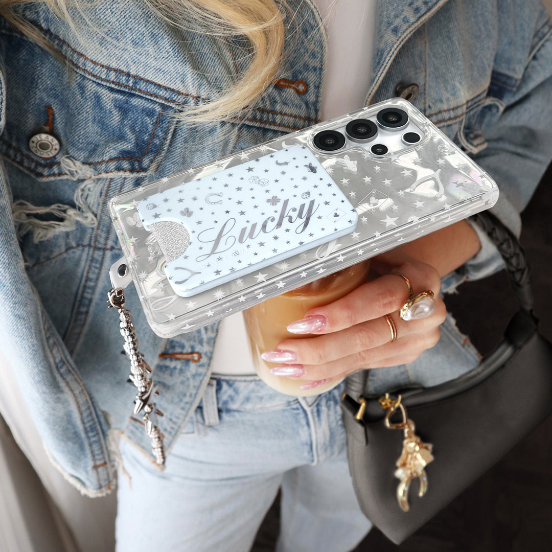 Lucky Girl! This protective phone case features 'Lucky' in white script along with white stars, ladybugs, dice, and more on a silver base with a holographic wave effect throughout.
