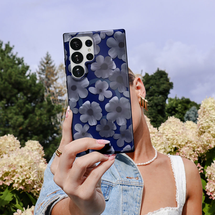Meet me at midnight! This protective case features 90s inspired grey-tone florals on a translucent navy case.