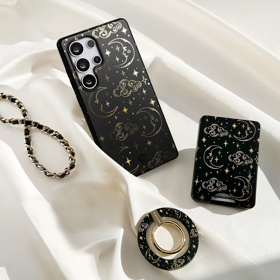Meet me in the moonlight! This protective case features gold chrome twinkling stars, crescent moons, and whimsical clouds on a matte black base.