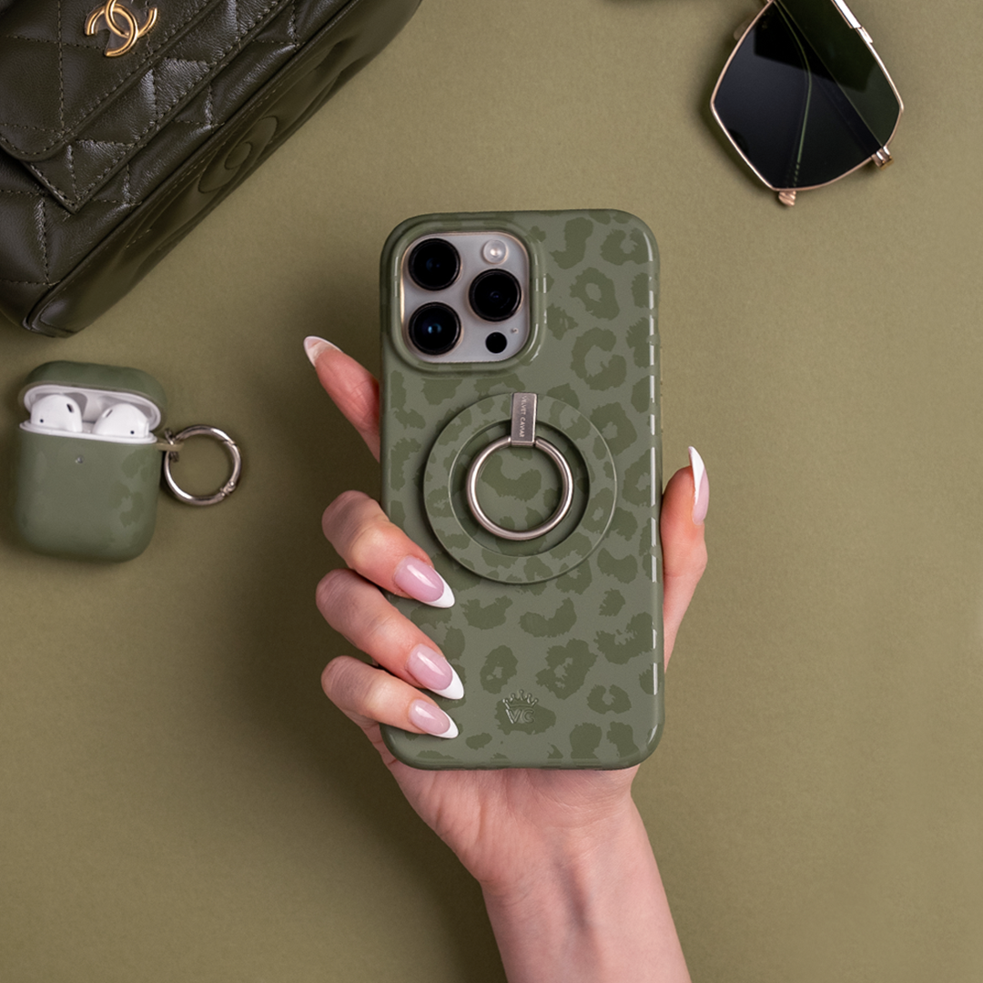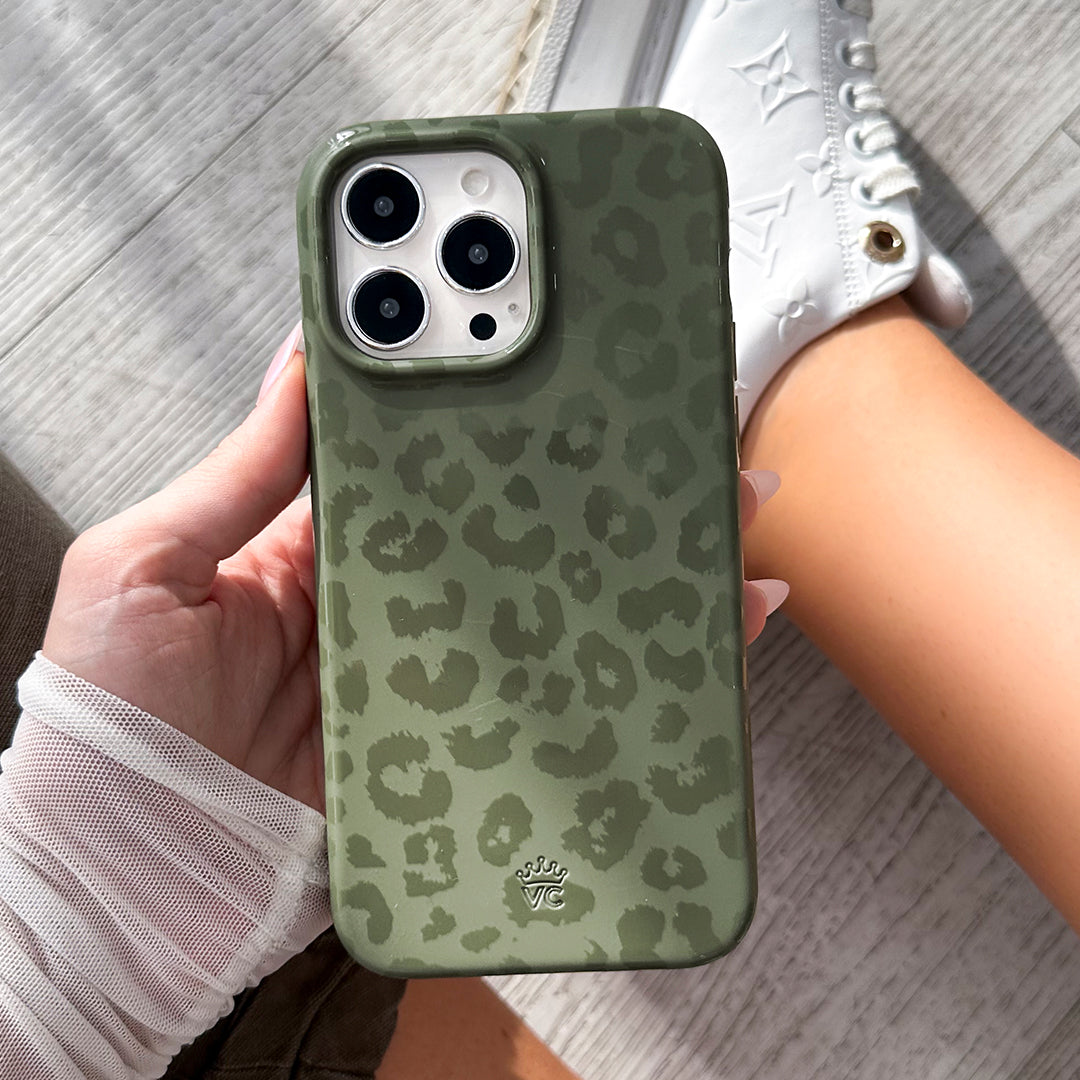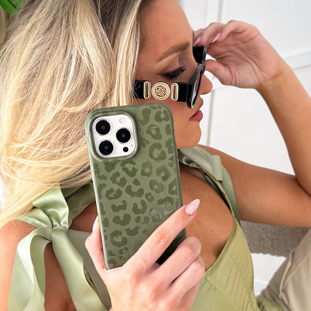One word, FIERCE! This protective case features glossy olive leopard spots on a monochromatic matte base.