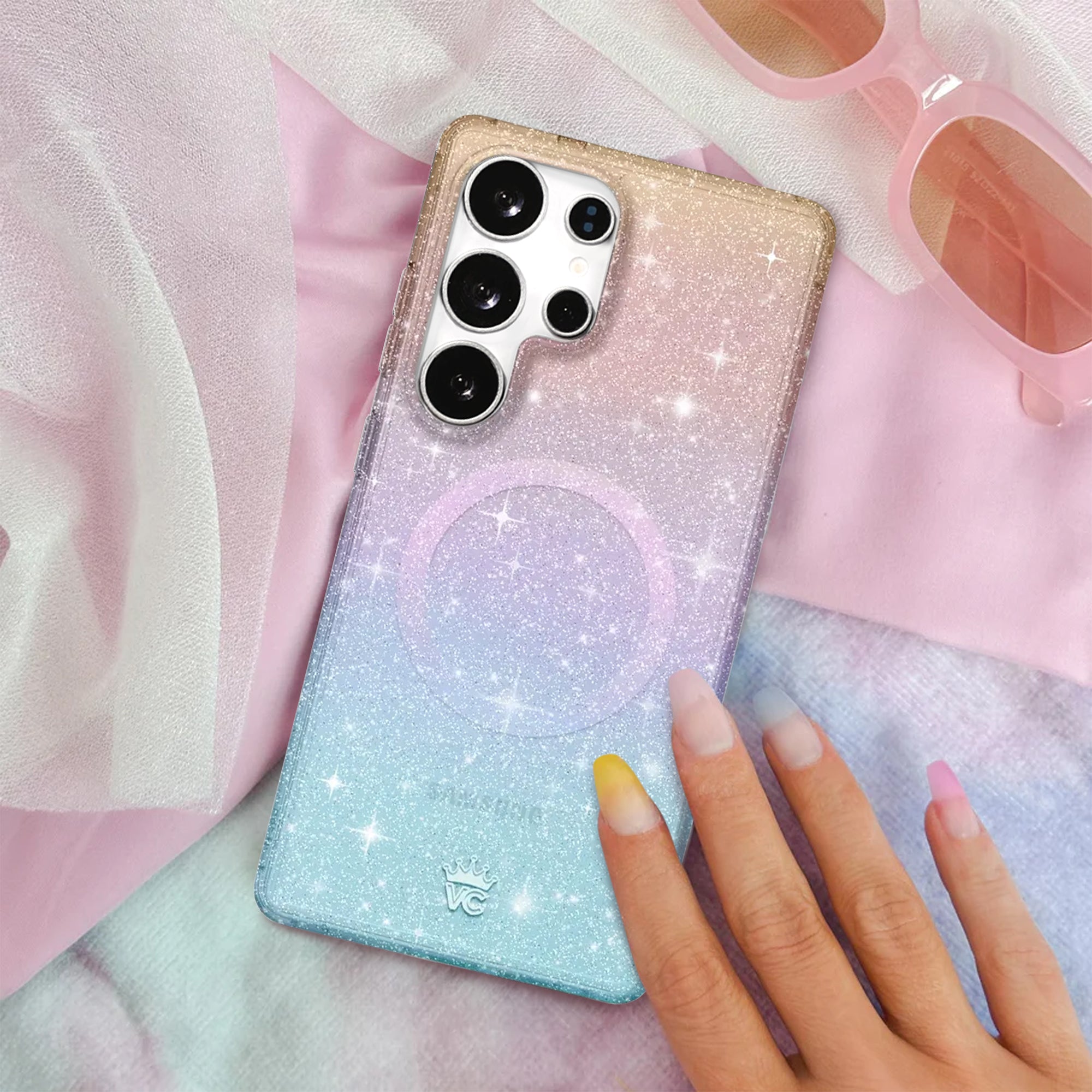 Shine like the star you are! This protective clear case features a soft pastel gradient of blues and purples with inlaid glitter sparkles.